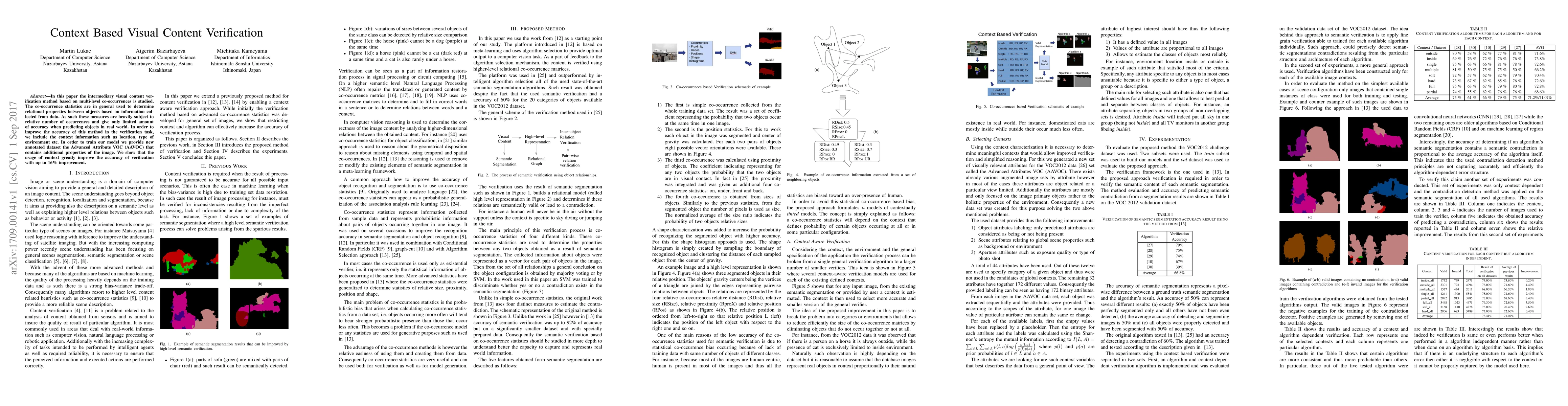 This paper proposes a visual content verification method using multi-level co-occurrences enhanced by context information like location and environment type. The study introduces a new annotated dataset, AAVOC, and demonstrates a significant up to 16% accuracy improvement in verification tasks.