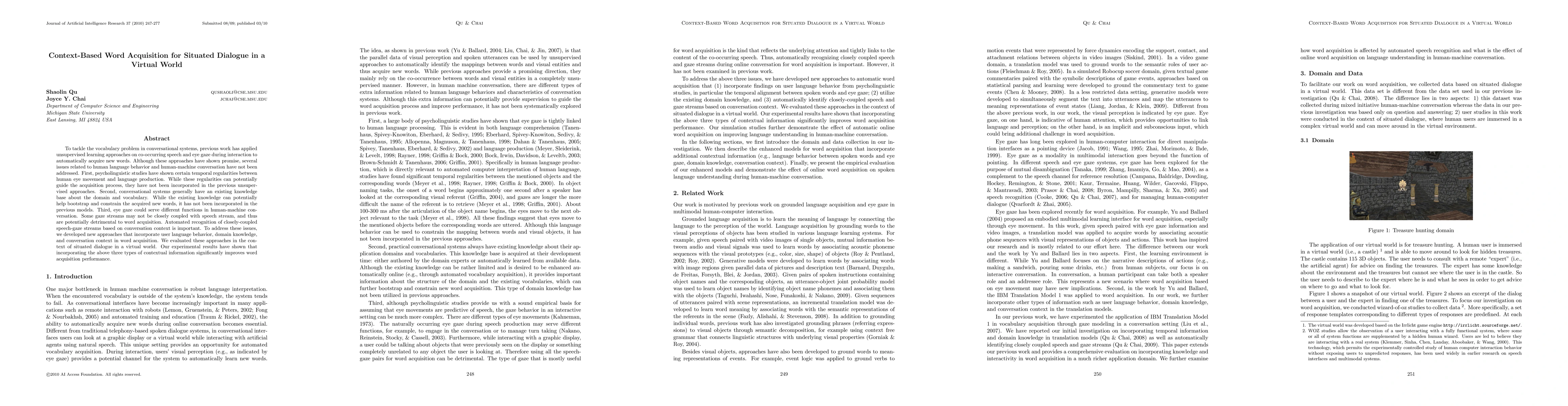 To tackle the vocabulary problem in conversational systems, previous work has applied unsupervised learning approaches on co-occurring speech and eye gaze during interaction to automatically acquire new words. Although these approaches have shown promise, several issues related to human language behavior and human-machine conversation have not been addressed. First, psycholinguistic studies have shown certain temporal regularities between human eye movement and language production. While these regularities can potentially guide the acquisition process, they have not been incorporated in the previous unsupervised approaches. Second, conversational systems generally have an existing knowledge base about the domain and vocabulary. While the existing knowledge can potentially help bootstrap and constrain the acquired new words, it has not been incorporated in the previous models. Third, eye gaze could serve different functions in human-machine conversation. Some gaze streams may not be closely coupled with speech stream, and thus are potentially detrimental to word acquisition. Automated recognition of closely-coupled speech-gaze streams based on conversation context is important. To address these issues, we developed new approaches that incorporate user language behavior, domain knowledge, and conversation context in word acquisition. We evaluated these approaches in the context of situated dialogue in a virtual world. Our experimental results have shown that incorporating the above three types of contextual information significantly improves word acquisition performance.