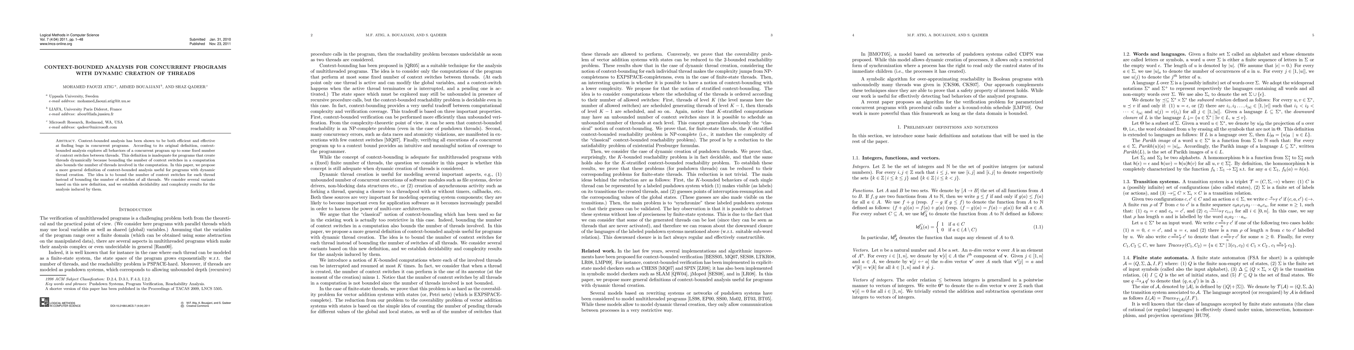 This paper proposes a refined context-bounded analysis for concurrent programs that dynamically create threads, addressing the inadequacy of traditional context-bounded analysis. It introduces a new definition that bounds context switches per thread rather than globally, establishing decidability and complexity results for the resulting analysis.