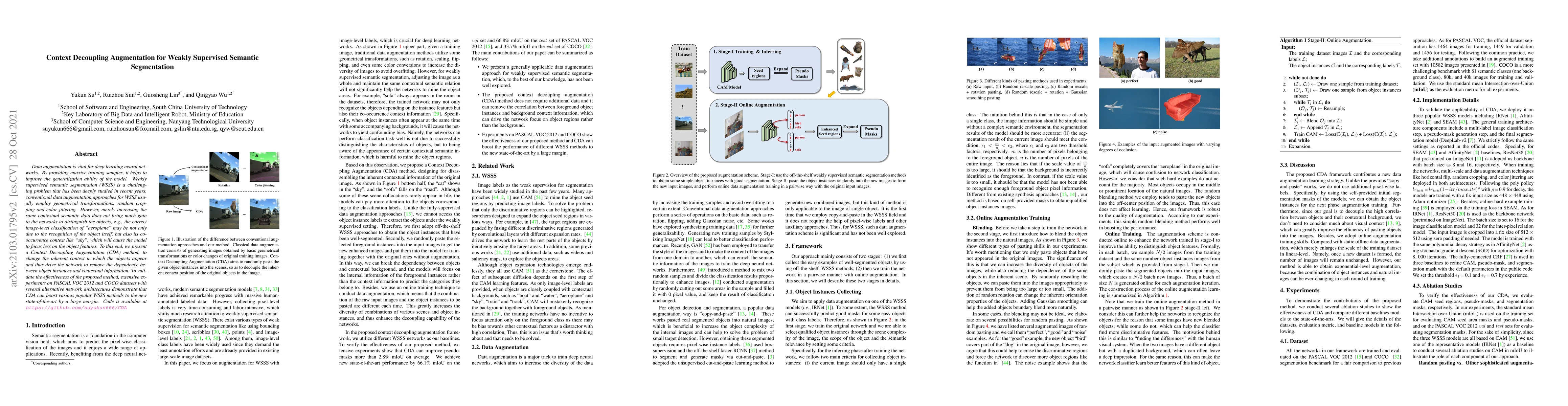 The paper introduces Context Decoupling Augmentation (CDA) to improve weakly supervised semantic segmentation by altering contextual information, thereby reducing reliance on contextual cues. Experiments on the PASCAL VOC 2012 dataset show that CDA significantly enhances the performance of various segmentation methods.