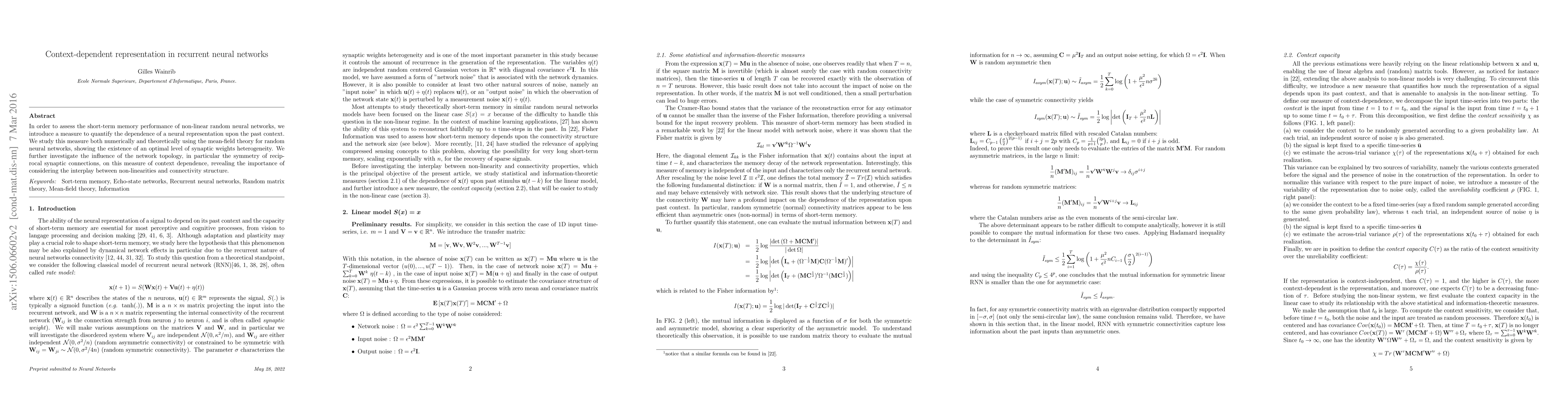 This paper introduces a measure to quantify the context-dependence of neural representations in recurrent neural networks, demonstrating an optimal level of synaptic heterogeneity. It explores the impact of network topology, especially symmetrical connections, on this context-dependence, highlighting the interplay between non-linearities and connectivity.