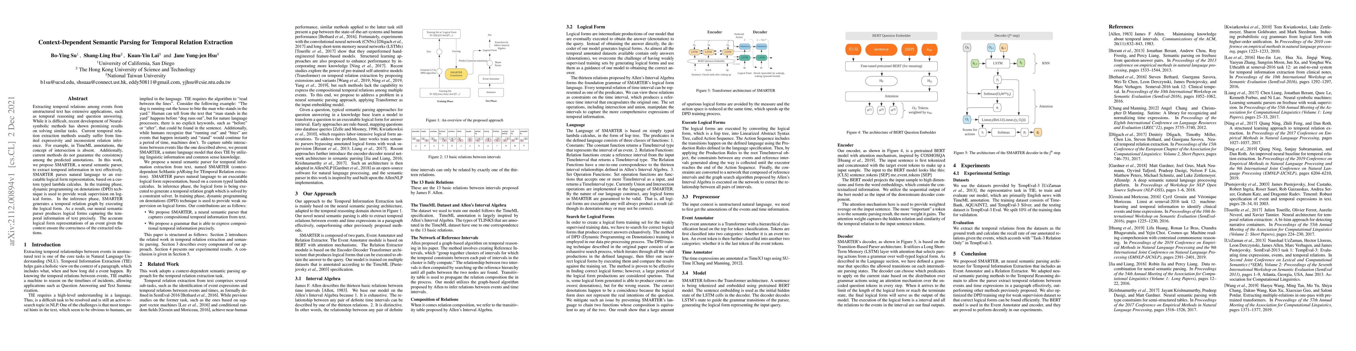 Extracting temporal relations among events from unstructured text has extensive applications, such as temporal reasoning and question answering. While it is difficult, recent development of Neural-symbolic methods has shown promising results on solving similar tasks. Current temporal relation extraction methods usually suffer from limited expressivity and inconsistent relation inference. For example, in TimeML annotations, the concept of intersection is absent. Additionally, current methods do not guarantee the consistency among the predicted annotations. In this work, we propose SMARTER, a neural semantic parser, to extract temporal information in text effectively. SMARTER parses natural language to an executable logical form representation, based on a custom typed lambda calculus. In the training phase, dynamic programming on denotations (DPD) technique is used to provide weak supervision on logical forms. In the inference phase, SMARTER generates a temporal relation graph by executing the logical form. As a result, our neural semantic parser produces logical forms capturing the temporal information of text precisely. The accurate logical form representations of an event given the context ensure the correctness of the extracted relations.