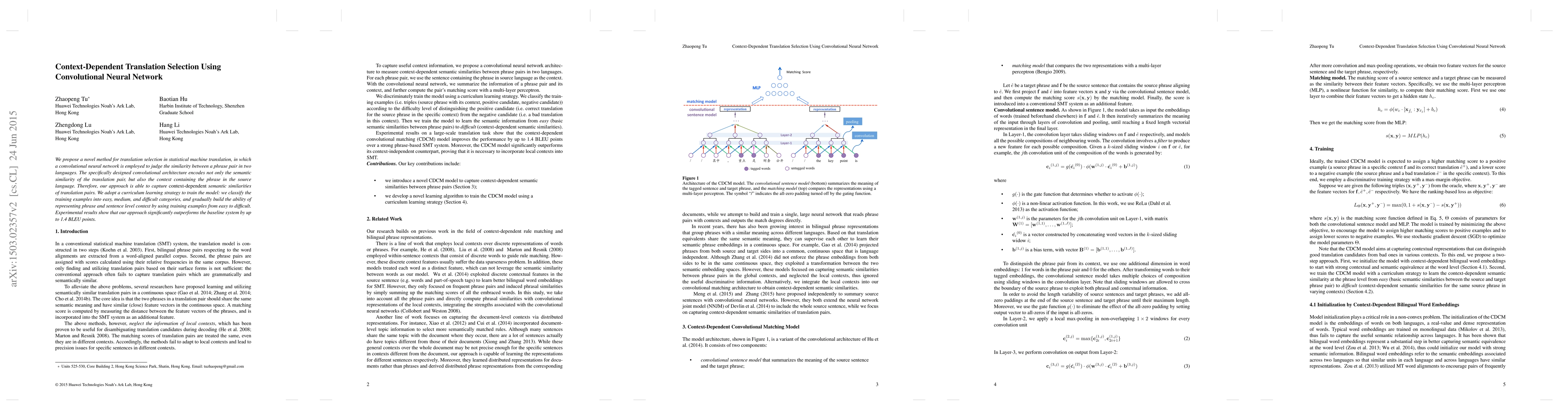 We propose a novel method for translation selection in statistical machine translation, in which a convolutional neural network is employed to judge the similarity between a phrase pair in two languages. The specifically designed convolutional architecture encodes not only the semantic similarity of the translation pair, but also the context containing the phrase in the source language. Therefore, our approach is able to capture context-dependent semantic similarities of translation pairs. We adopt a curriculum learning strategy to train the model: we classify the training examples into easy, medium, and difficult categories, and gradually build the ability of representing phrase and sentence level context by using training examples from easy to difficult. Experimental results show that our approach significantly outperforms the baseline system by up to 1.4 BLEU points.