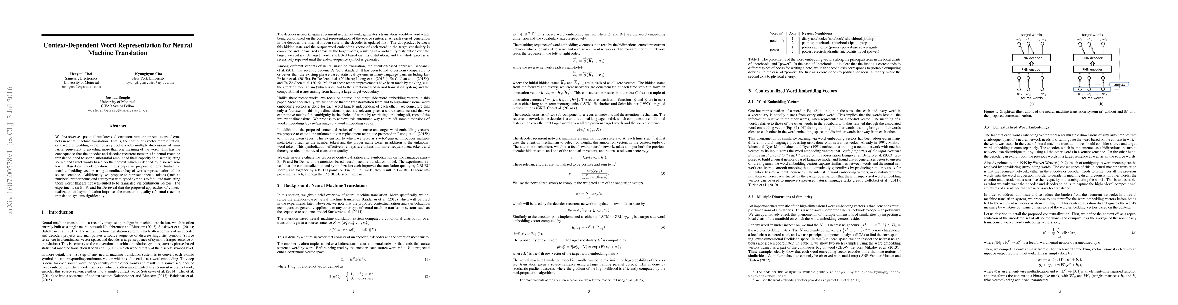 This paper addresses the issue of continuous vector representations in neural machine translation, proposing contextualized word embeddings and typed symbols for special tokens to improve translation quality. Experiments on English-French and English-German translations show significant improvements.