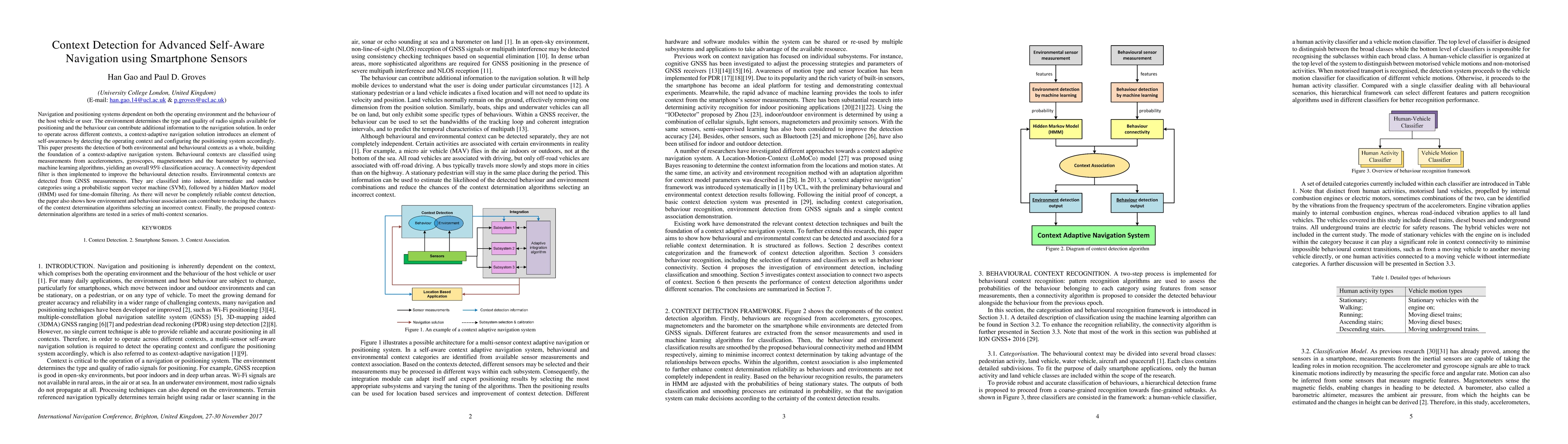 This paper introduces a context-adaptive navigation system that detects environmental and behavioral contexts using machine learning algorithms and GNSS measurements. It achieves high classification accuracy for behavioral contexts (95%) and proposes a framework for reducing errors in context determination.