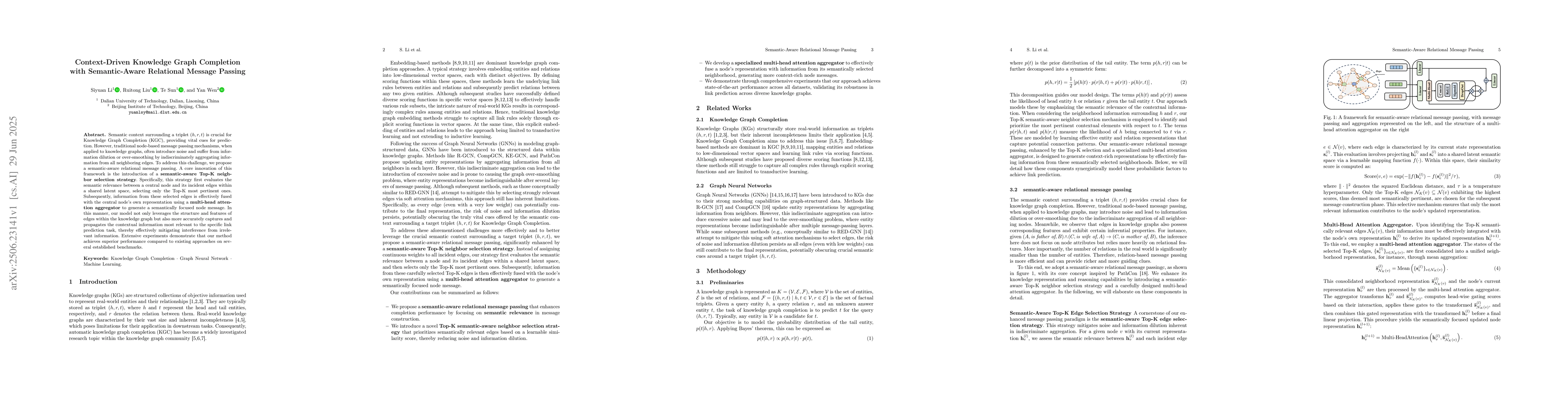 Semantic context surrounding a triplet $(h, r, t)$ is crucial for Knowledge Graph Completion (KGC), providing vital cues for prediction. However, traditional node-based message passing mechanisms, when applied to knowledge graphs, often introduce noise and suffer from information dilution or over-smoothing by indiscriminately aggregating information from all neighboring edges. To address this challenge, we propose a semantic-aware relational message passing. A core innovation of this framework is the introduction of a \textbf{semantic-aware Top-K neighbor selection strategy}. Specifically, this strategy first evaluates the semantic relevance between a central node and its incident edges within a shared latent space, selecting only the Top-K most pertinent ones. Subsequently, information from these selected edges is effectively fused with the central node's own representation using a \textbf{multi-head attention aggregator} to generate a semantically focused node message. In this manner, our model not only leverages the structure and features of edges within the knowledge graph but also more accurately captures and propagates the contextual information most relevant to the specific link prediction task, thereby effectively mitigating interference from irrelevant information. Extensive experiments demonstrate that our method achieves superior performance compared to existing approaches on several established benchmarks.