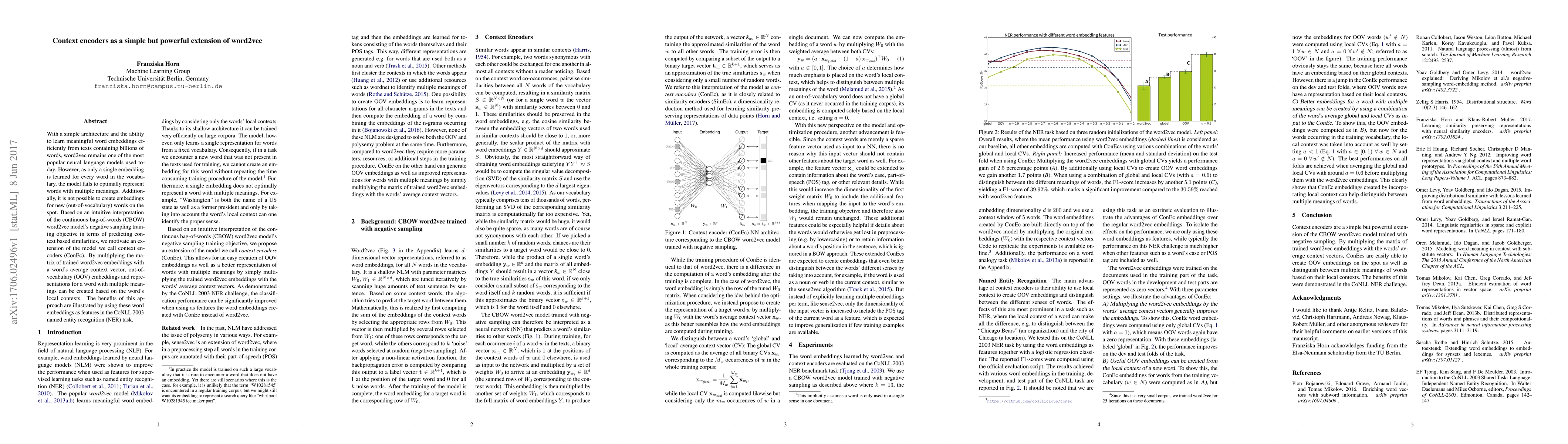 With a simple architecture and the ability to learn meaningful word embeddings efficiently from texts containing billions of words, word2vec remains one of the most popular neural language models used today. However, as only a single embedding is learned for every word in the vocabulary, the model fails to optimally represent words with multiple meanings. Additionally, it is not possible to create embeddings for new (out-of-vocabulary) words on the spot. Based on an intuitive interpretation of the continuous bag-of-words (CBOW) word2vec model's negative sampling training objective in terms of predicting context based similarities, we motivate an extension of the model we call context encoders (ConEc). By multiplying the matrix of trained word2vec embeddings with a word's average context vector, out-of-vocabulary (OOV) embeddings and representations for a word with multiple meanings can be created based on the word's local contexts. The benefits of this approach are illustrated by using these word embeddings as features in the CoNLL 2003 named entity recognition (NER) task.