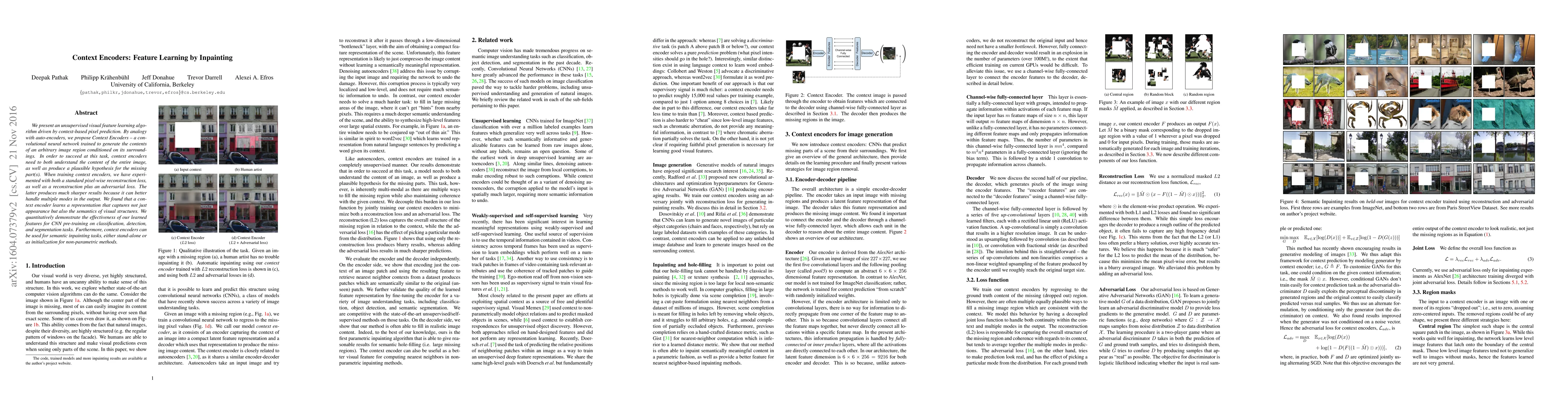 This paper introduces Context Encoders, an unsupervised feature learning algorithm that trains a convolutional neural network to predict missing image regions based on context. The method combines reconstruction and adversarial losses, leading to sharper results and a representation that captures both appearance and semantics.