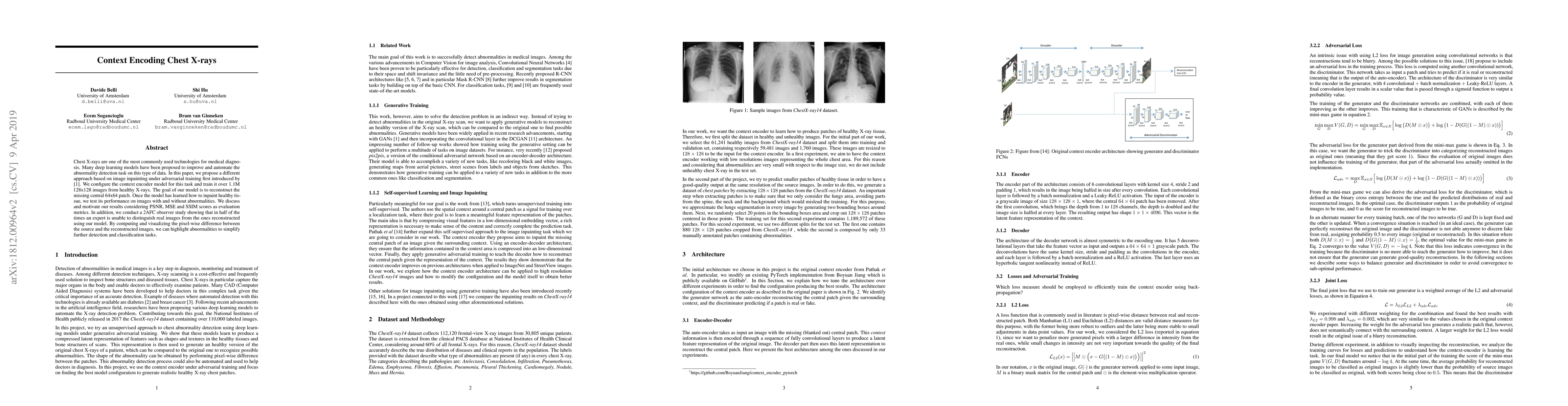 Chest X-rays are one of the most commonly used technologies for medical diagnosis. Many deep learning models have been proposed to improve and automate the abnormality detection task on this type of data. In this paper, we propose a different approach based on image inpainting under adversarial training first introduced by Goodfellow et al. We configure the context encoder model for this task and train it over 1.1M 128x128 images from healthy X-rays. The goal of our model is to reconstruct the missing central 64x64 patch. Once the model has learned how to inpaint healthy tissue, we test its performance on images with and without abnormalities. We discuss and motivate our results considering PSNR, MSE and SSIM scores as evaluation metrics. In addition, we conduct a 2AFC observer study showing that in half of the times an expert is unable to distinguish real images from the ones reconstructed using our model. By computing and visualizing the pixel-wise difference between the source and the reconstructed images, we can highlight abnormalities to simplify further detection and classification tasks.