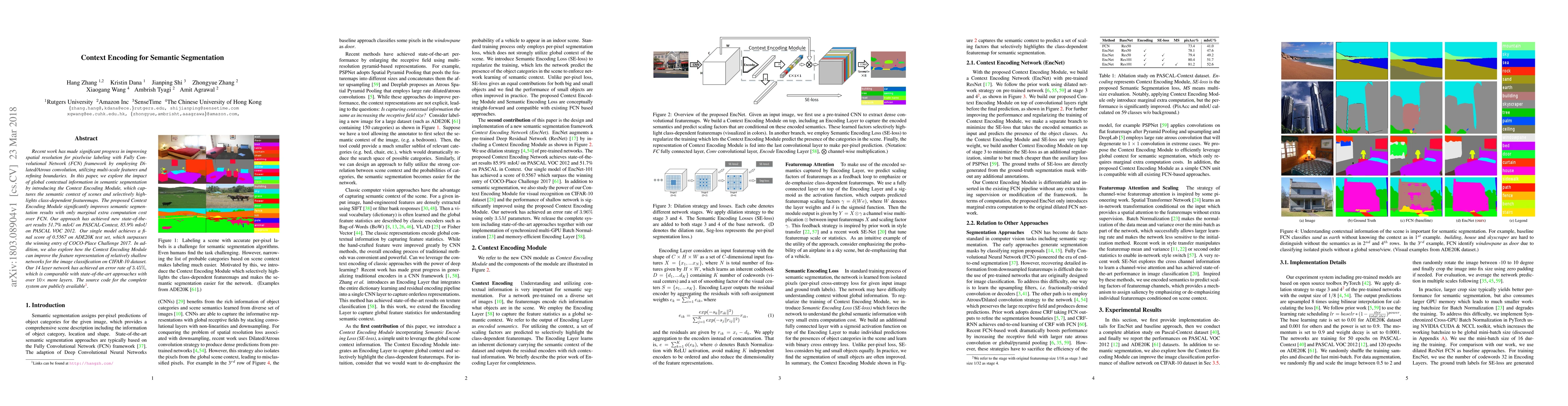 This paper introduces a Context Encoding Module to enhance semantic segmentation using Fully Convolutional Networks, achieving state-of-the-art results with minimal extra computation. It also improves feature representation for shallow networks in image classification tasks.