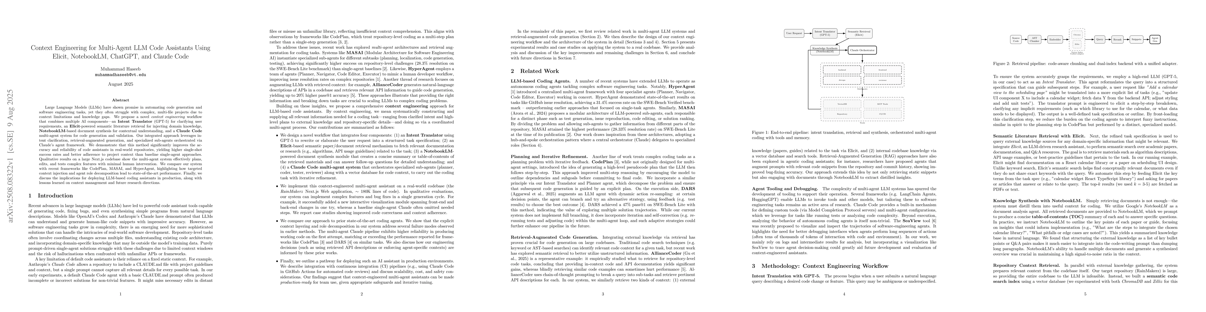 Large Language Models (LLMs) have shown promise in automating code generation and software engineering tasks, yet they often struggle with complex, multi-file projects due to context limitations and knowledge gaps. We propose a novel context engineering workflow that combines multiple AI components: an Intent Translator (GPT-5) for clarifying user requirements, an Elicit-powered semantic literature retrieval for injecting domain knowledge, NotebookLM-based document synthesis for contextual understanding, and a Claude Code multi-agent system for code generation and validation. Our integrated approach leverages intent clarification, retrieval-augmented generation, and specialized sub-agents orchestrated via Claude's agent framework. We demonstrate that this method significantly improves the accuracy and reliability of code assistants in real-world repositories, yielding higher single-shot success rates and better adherence to project context than baseline single-agent approaches. Qualitative results on a large Next.js codebase show the multi-agent system effectively plans, edits, and tests complex features with minimal human intervention. We compare our system with recent frameworks like CodePlan, MASAI, and HyperAgent, highlighting how targeted context injection and agent role decomposition lead to state-of-the-art performance. Finally, we discuss the implications for deploying LLM-based coding assistants in production, along with lessons learned on context management and future research directions.