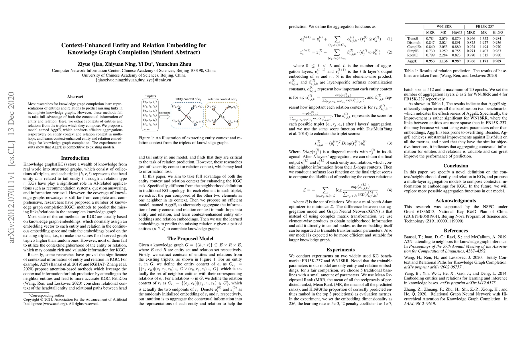 The paper proposes AggrE, a model that aggregates context-enhanced entity and relation embeddings from triplets in multi-hops to improve knowledge graph completion. Experimental results demonstrate its competitive performance against existing methods.