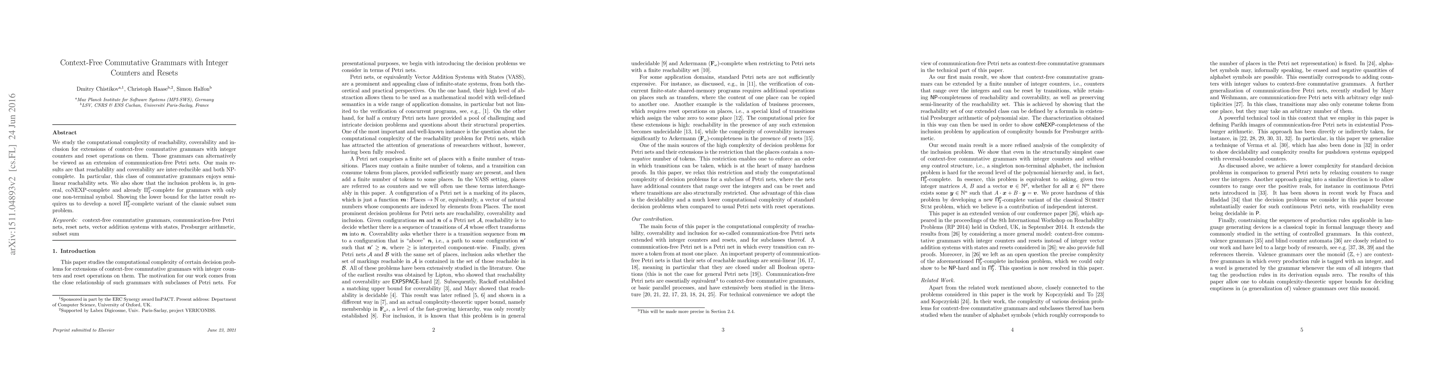 This paper examines context-free commutative grammars enhanced with integer counters and reset operations, revealing they are NP-complete for reachability and coverability, and coNEXP-complete for inclusion, with $\Pi_2^\text{P}$-completeness for a single non-terminal variant.