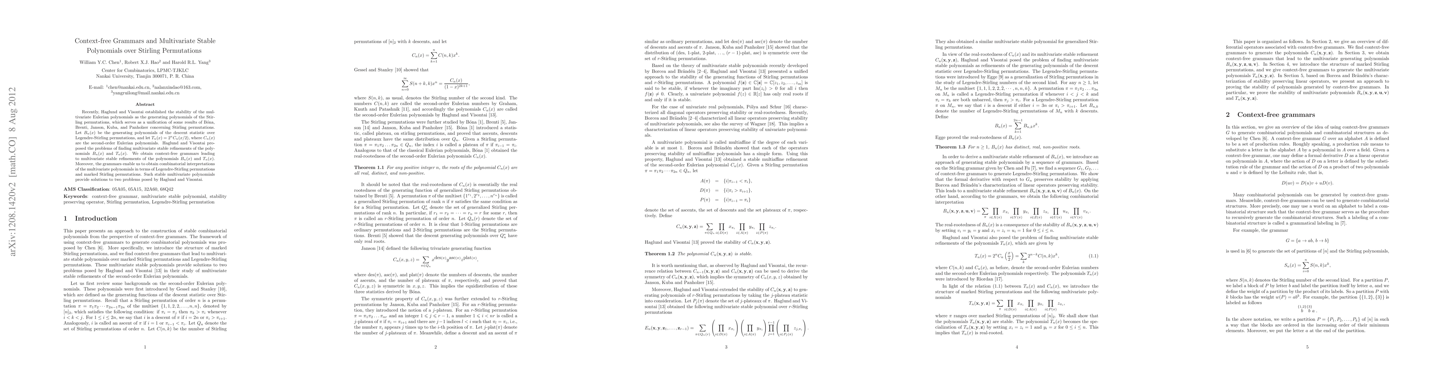 The paper introduces a novel method for generating multivariate stable polynomials using context-free grammars, leading to combinatorial interpretations in terms of Legendre-Stirling permutations and marked Stirling permutations.