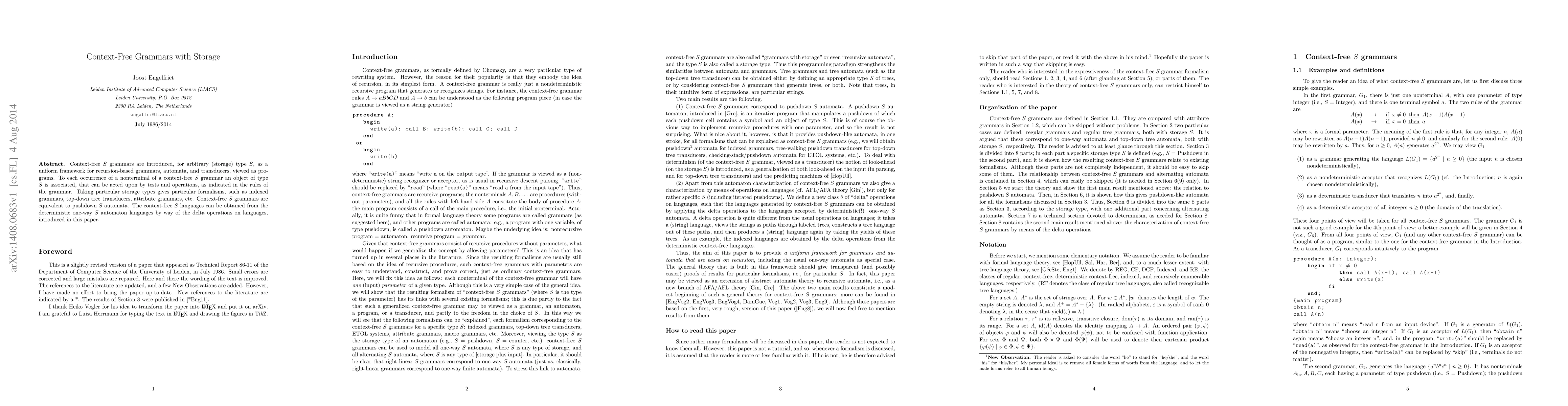 This research introduces context-free S grammars as a general framework encompassing recursion-based grammars, automata, and transducers, each utilizing a specific storage type S. These grammars enable operations on objects of type S within rules, thus generating formalisms like indexed grammars and attribute grammars.