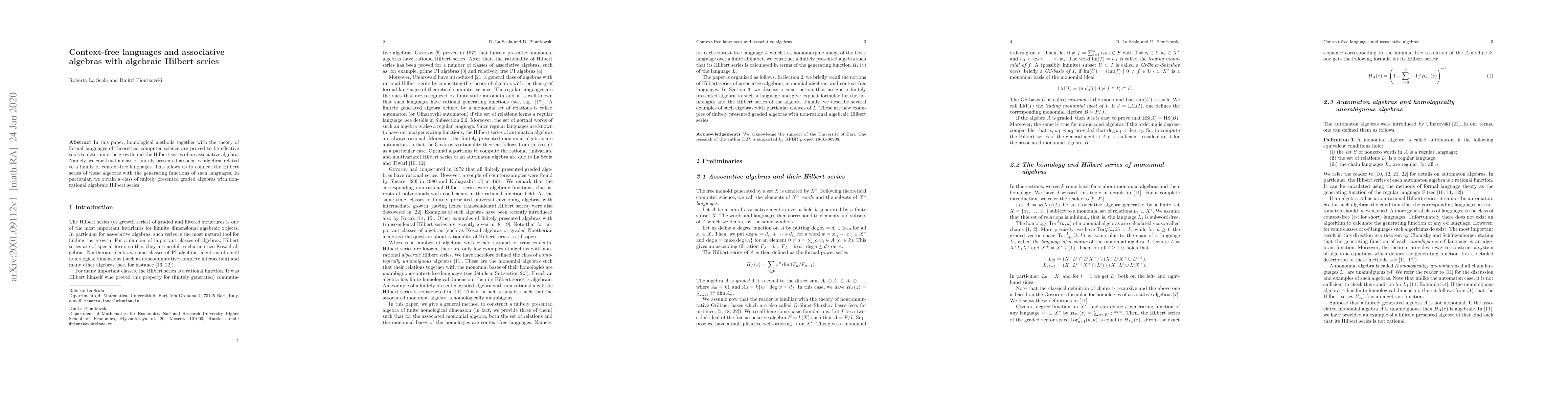 This paper uses homological methods and formal language theory to determine the growth and Hilbert series of associative algebras, constructing a class of algebras linked to context-free languages and obtaining graded algebras with non-rational algebraic Hilbert series.