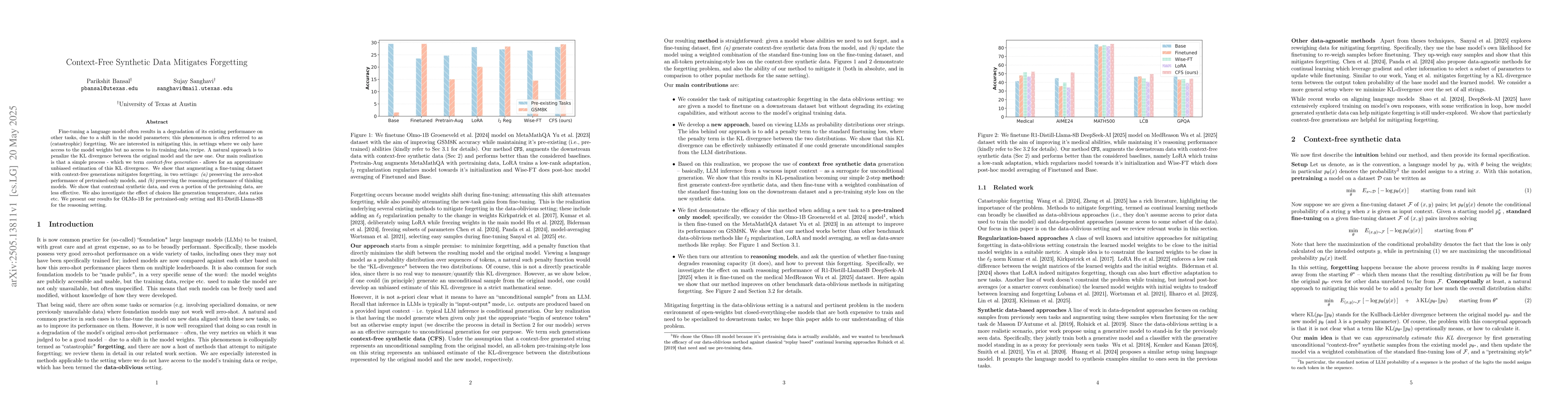 Fine-tuning a language model often results in a degradation of its existing performance on other tasks, due to a shift in the model parameters; this phenomenon is often referred to as (catastrophic) forgetting. We are interested in mitigating this, in settings where we only have access to the model weights but no access to its training data/recipe. A natural approach is to penalize the KL divergence between the original model and the new one. Our main realization is that a simple process - which we term context-free generation - allows for an approximate unbiased estimation of this KL divergence. We show that augmenting a fine-tuning dataset with context-free generations mitigates forgetting, in two settings: (a) preserving the zero-shot performance of pretrained-only models, and (b) preserving the reasoning performance of thinking models. We show that contextual synthetic data, and even a portion of the pretraining data, are less effective. We also investigate the effect of choices like generation temperature, data ratios etc. We present our results for OLMo-1B for pretrained-only setting and R1-Distill-Llama-8B for the reasoning setting.