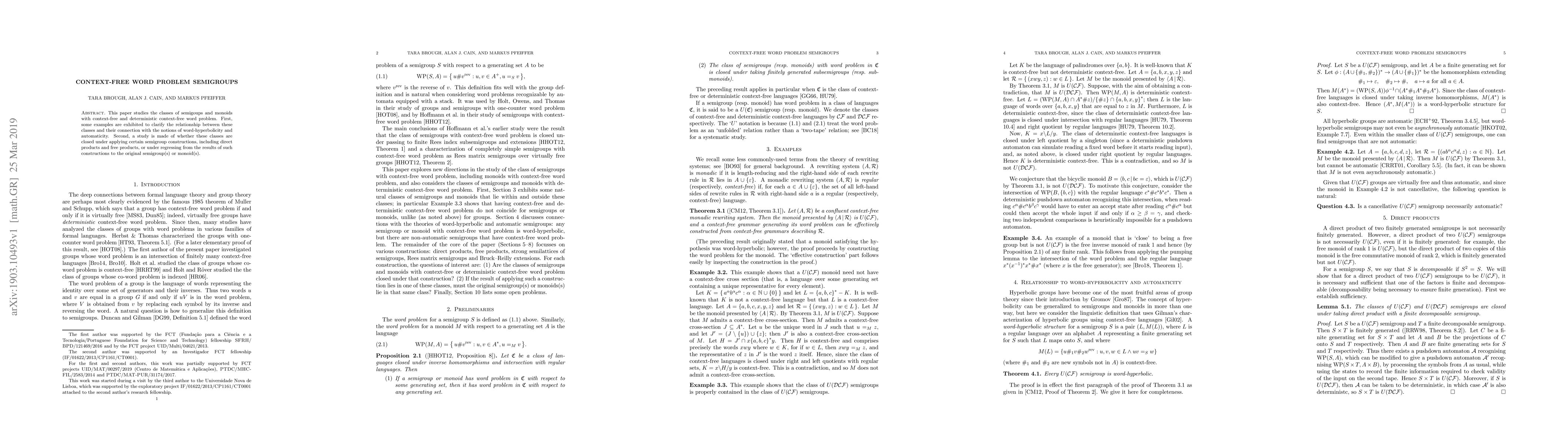 This paper investigates semigroups and monoids with context-free and deterministic context-free word problems, examining their properties and closure under various semigroup constructions like direct and free products. It also explores their connection to word-hyperbolicity and automaticity.