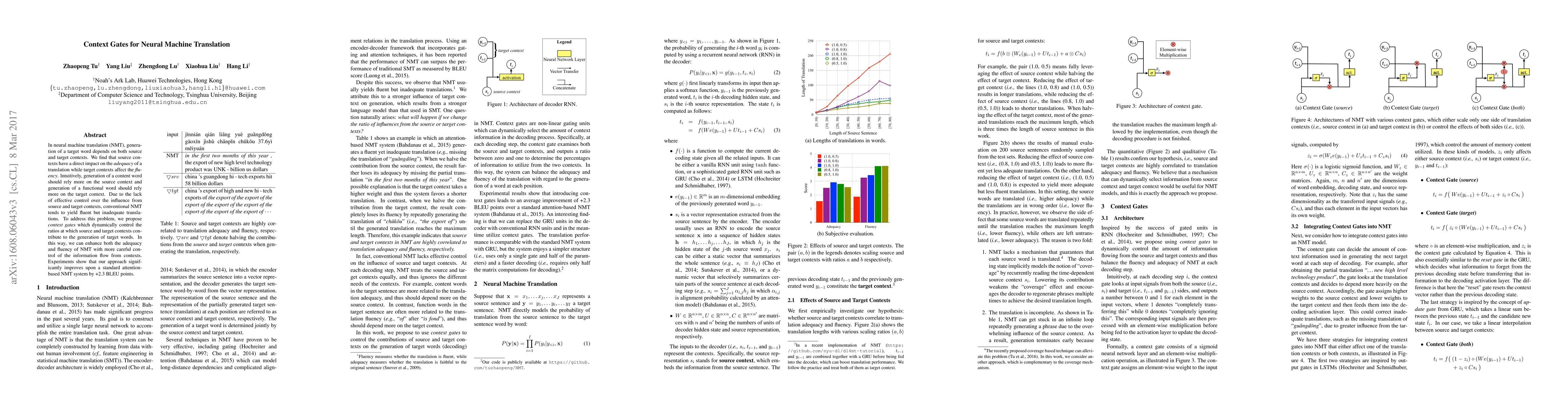 The paper proposes context gates to dynamically adjust the influence of source and target contexts in neural machine translation, aiming to improve both translation adequacy and fluency. Experimental results show a +2.3 BLEU point improvement over standard attention-based NMT systems.