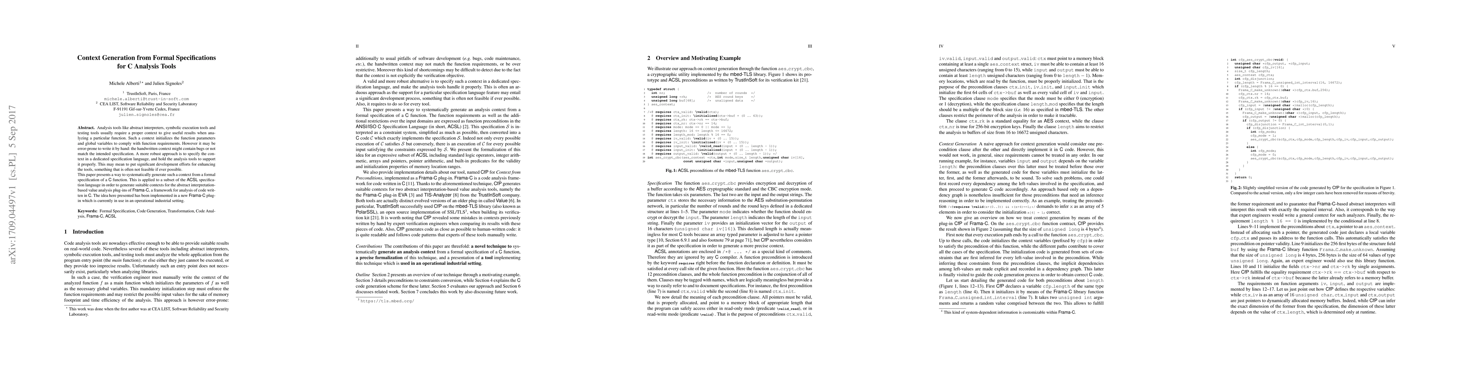 Analysis tools like abstract interpreters, symbolic execution tools and testing tools usually require a proper context to give useful results when analyzing a particular function. Such a context initializes the function parameters and global variables to comply with function requirements. However it may be error-prone to write it by hand: the handwritten context might contain bugs or not match the intended specification. A more robust approach is to specify the context in a dedicated specification language, and hold the analysis tools to support it properly. This may mean to put significant development efforts for enhancing the tools, something that is often not feasible if ever possible. This paper presents a way to systematically generate such a context from a formal specification of a C function. This is applied to a subset of the ACSL specification language in order to generate suitable contexts for the abstract interpretation-based value analysis plug-ins of Frama-C, a framework for analysis of code written in C. The idea here presented has been implemented in a new Frama-C plug-in which is currently in use in an operational industrial setting.