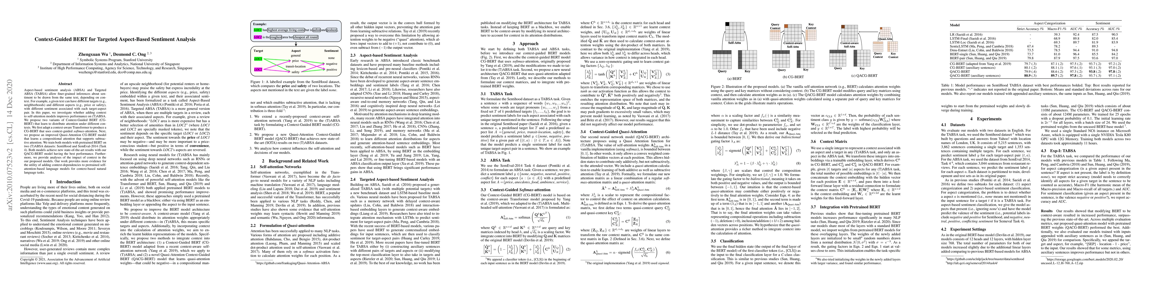 The paper proposes two context-guided BERT models (CG-BERT and QACG-BERT) for Targeted Aspect-Based Sentiment Analysis (TABSA) tasks, integrating context into BERT's self-attention mechanism. These models are trained on SentiHood and SemEval-2014 (Task 4) datasets.