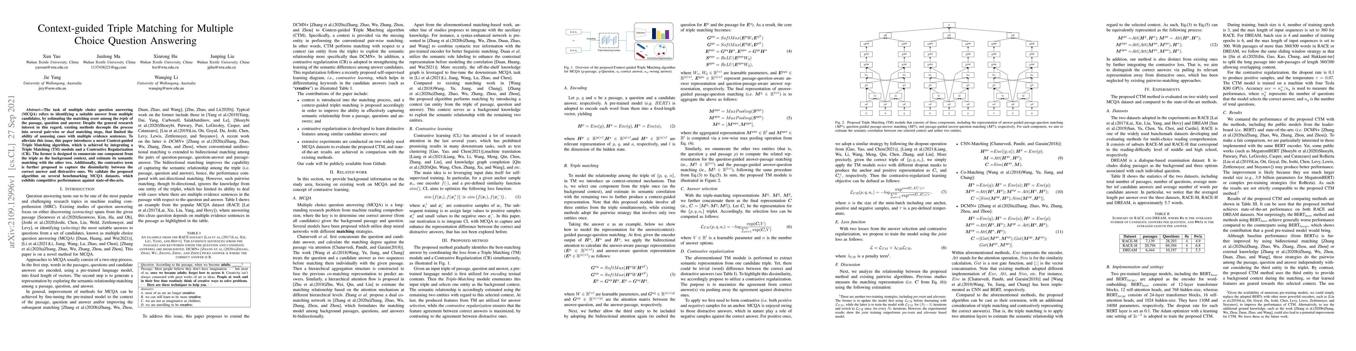 This paper proposes a Context-guided Triple Matching algorithm for multiple choice question answering, combining a Triple Matching module and Contrastive Regularization to better assess cases with multiple evidence sentences. The method shows competitive performance on benchmark datasets compared to state-of-the-art approaches.