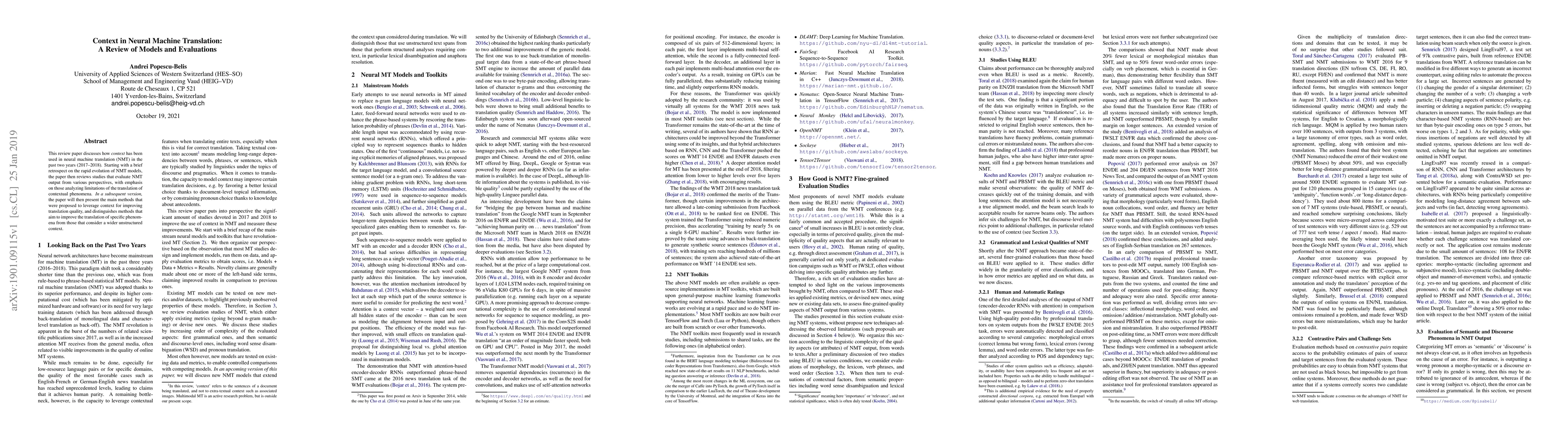 This review paper examines the role of context in neural machine translation (NMT) from 2017-2018, highlighting studies that assess NMT outputs and identify limitations in translating contextual phenomena. Future sections will detail methods proposed to enhance translation quality through contextual information.