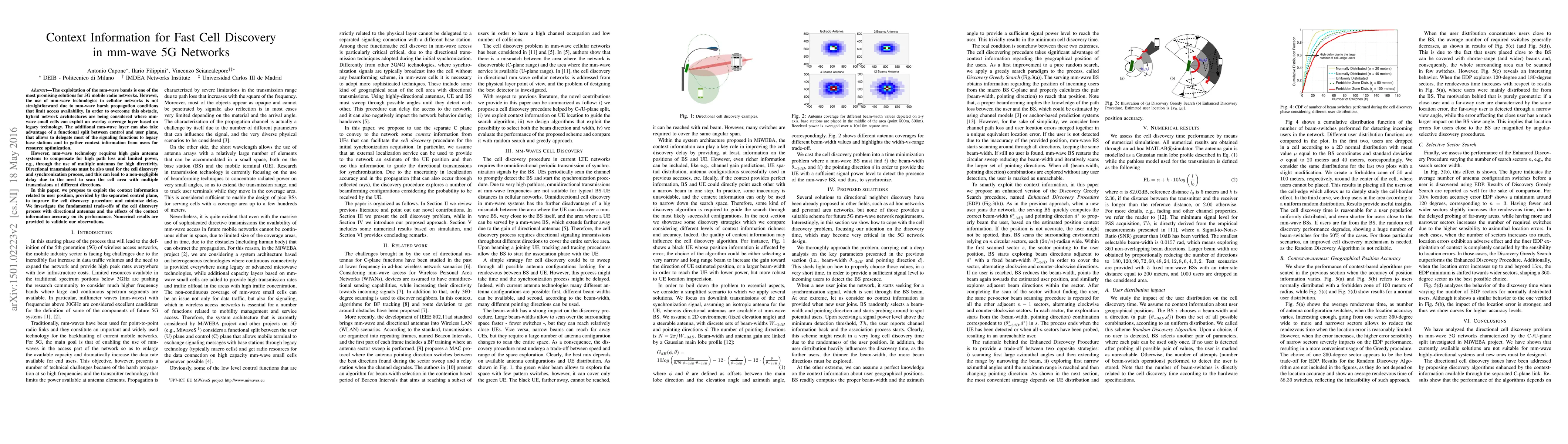 The exploitation of the mm-wave bands is one of the most promising solutions for 5G mobile radio networks. However, the use of mm-wave technologies in cellular networks is not straightforward due to mm-wave harsh propagation conditions that limit access availability. In order to overcome this obstacle, hybrid network architectures are being considered where mm-wave small cells can exploit an overlay coverage layer based on legacy technology. The additional mm-wave layer can also take advantage of a functional split between control and user plane, that allows to delegate most of the signaling functions to legacy base stations and to gather context information from users for resource optimization. However, mm-wave technology requires high gain antenna systems to compensate for high path loss and limited power, e.g., through the use of multiple antennas for high directivity. Directional transmissions must be also used for the cell discovery and synchronization process, and this can lead to a non-negligible delay due to the need to scan the cell area with multiple transmissions at different directions. In this paper, we propose to exploit the context information related to user position, provided by the separated control plane, to improve the cell discovery procedure and minimize delay. We investigate the fundamental trade-offs of the cell discovery process with directional antennas and the effects of the context information accuracy on its performance. Numerical results are provided to validate our observations.