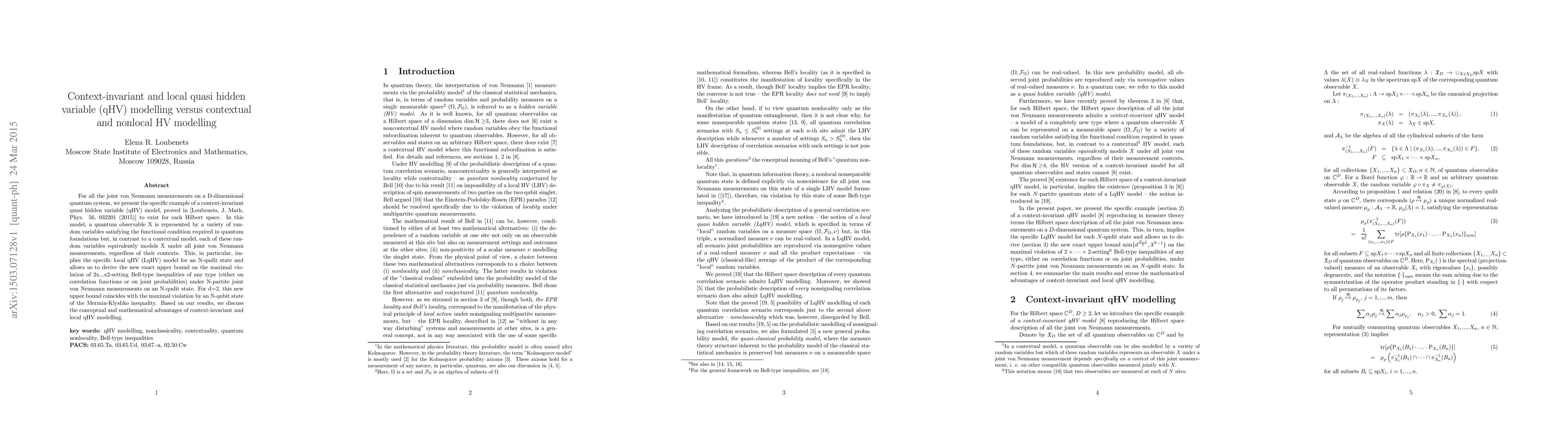 For all the joint von Neumann measurements on a D-dimensional quantum system, we present the specific example of a context-invariant quasi hidden variable (qHV) model, proved in [Loubenets, J. Math. Phys. 56, 032201 (2015)] to exist for each Hilbert space. In this model, a quantum observable X is represented by a variety of random variables satisfying the functional condition required in quantum foundations but, in contrast to a contextual model, each of these random variables equivalently models X under all joint von Neumann measurements, regardless of their contexts. This, in particular, implies the specific local qHV (LqHV) model for an N-qudit state and allows us to derive the new exact upper bound on the maximal violation of 2x...x2-setting Bell-type inequalities of any type (either on correlation functions or on joint probabilities) under N-partite joint von Neumann measurements on an N-qudit state. For d=2, this new upper bound coincides with the maximal violation by an N-qubit state of the Mermin-Klyshko inequality. Based on our results, we discuss the conceptual and mathematical advantages of context-invariant and local qHV modelling.