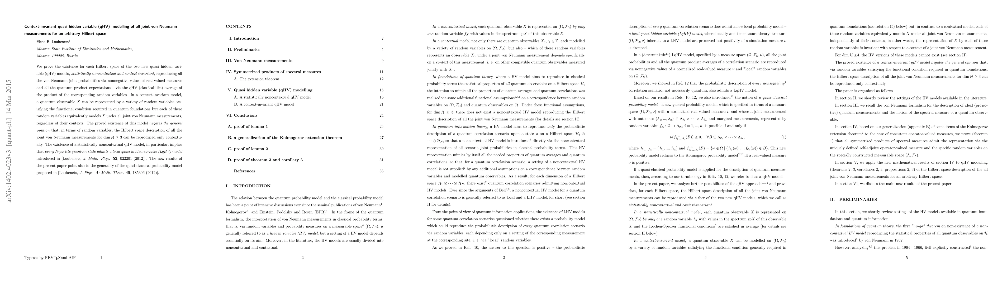 We prove the existence for each Hilbert space of the two new quasi hidden variable (qHV) models, statistically noncontextual and context-invariant, reproducing all the von Neumann joint probabilities via nonnegative values of real-valued measures and all the quantum product expectations -- via the qHV (classical-like) average of the product of the corresponding random variables. In a context-invariant model, a quantum observable X can be represented by a variety of random variables satisfying the functional condition required in quantum foundations but each of these random variables equivalently models X under all joint von Neumann measurements, regardless of their contexts. The proved existence of this model negates the general opinion that, in terms of random variables, the Hilbert space description of all the joint von Neumann measurements for dimH>2 can be reproduced only contextually. The existence of a statistically noncontextual qHV model, in particular, implies that every N-partite quantum state admits a local quasi hidden variable (LqHV) model introduced in [Loubenets, J. Math. Phys. 53, 022201 (2012)]. The new results of the present paper point also to the generality of the quasi-classical probability model proposed in [Loubenets, J. Phys. A: Math. Theor. 45, 185306 (2012)].