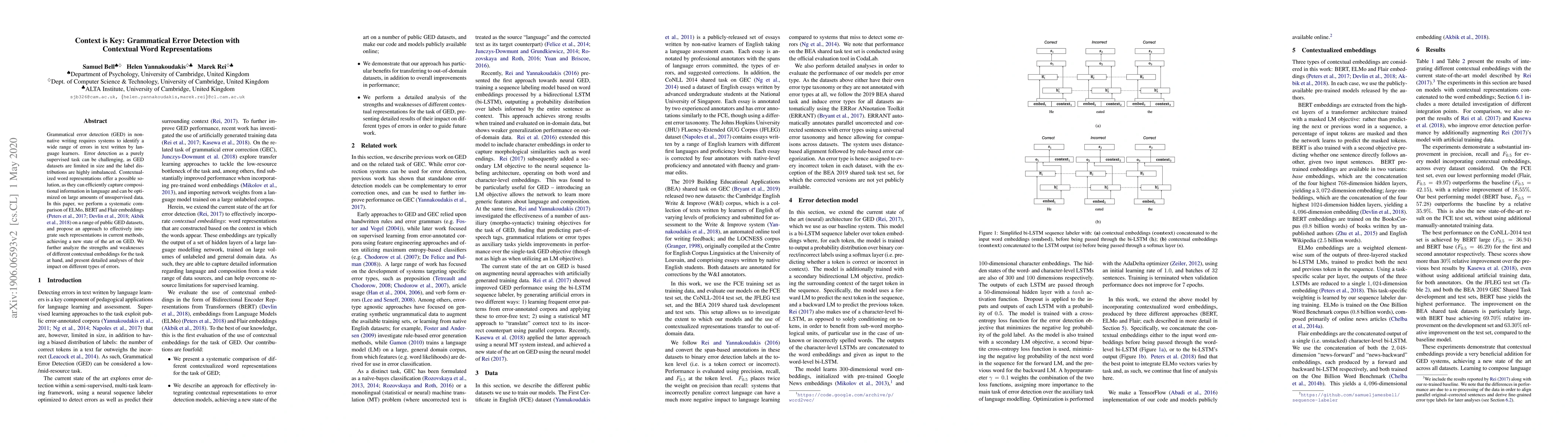 A study compares ELMo, BERT, and Flair embeddings for grammatical error detection in non-native writing, finding that contextualized word representations improve state-of-the-art results on large datasets.