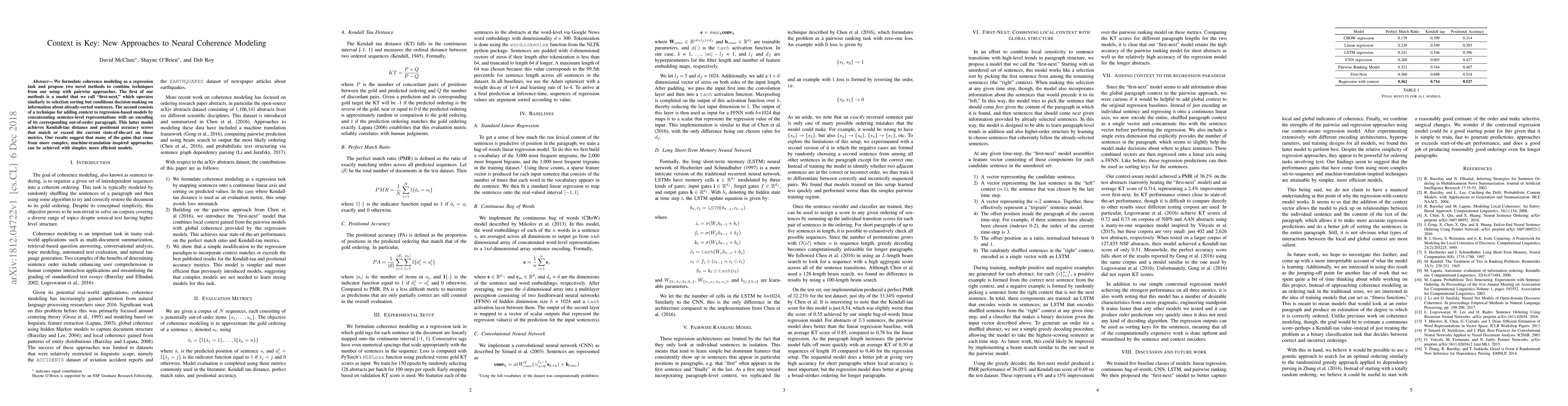 We formulate coherence modeling as a regression task and propose two novel methods to combine techniques from our setup with pairwise approaches. The first of our methods is a model that we call "first-next," which operates similarly to selection sorting but conditions decision-making on information about already-sorted sentences. The second consists of a technique for adding context to regression-based models by concatenating sentence-level representations with an encoding of its corresponding out-of-order paragraph. This latter model achieves Kendall-tau distance and positional accuracy scores that match or exceed the current state-of-the-art on these metrics. Our results suggest that many of the gains that come from more complex, machine-translation inspired approaches can be achieved with simpler, more efficient models.