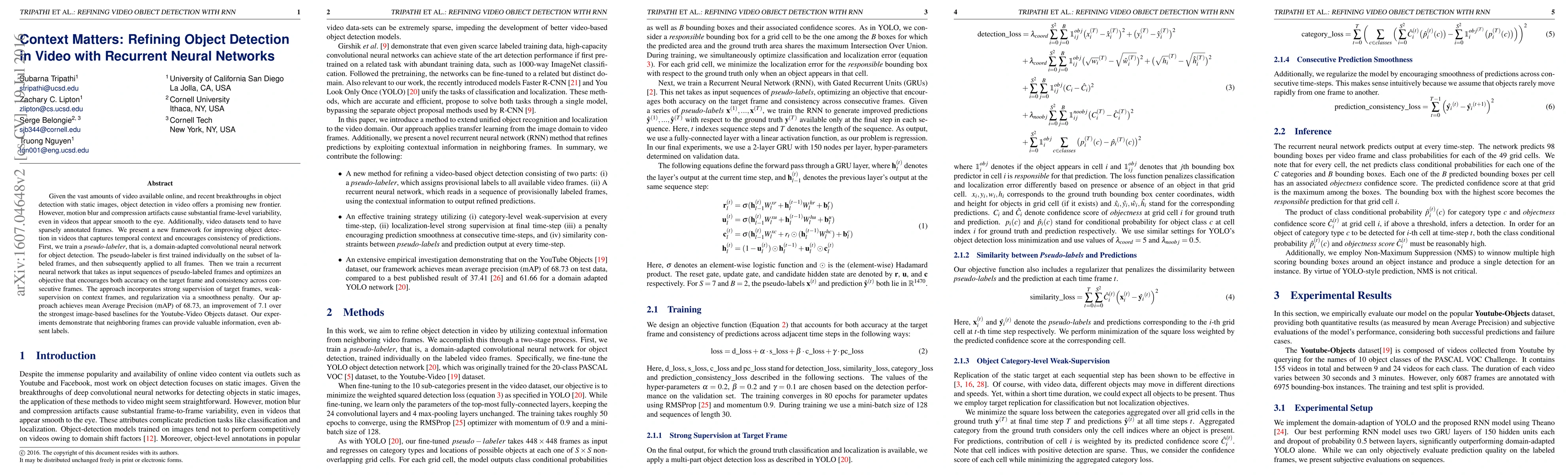 Given the vast amounts of video available online, and recent breakthroughs in object detection with static images, object detection in video offers a promising new frontier. However, motion blur and compression artifacts cause substantial frame-level variability, even in videos that appear smooth to the eye. Additionally, video datasets tend to have sparsely annotated frames. We present a new framework for improving object detection in videos that captures temporal context and encourages consistency of predictions. First, we train a pseudo-labeler, that is, a domain-adapted convolutional neural network for object detection. The pseudo-labeler is first trained individually on the subset of labeled frames, and then subsequently applied to all frames. Then we train a recurrent neural network that takes as input sequences of pseudo-labeled frames and optimizes an objective that encourages both accuracy on the target frame and consistency across consecutive frames. The approach incorporates strong supervision of target frames, weak-supervision on context frames, and regularization via a smoothness penalty. Our approach achieves mean Average Precision (mAP) of 68.73, an improvement of 7.1 over the strongest image-based baselines for the Youtube-Video Objects dataset. Our experiments demonstrate that neighboring frames can provide valuable information, even absent labels.