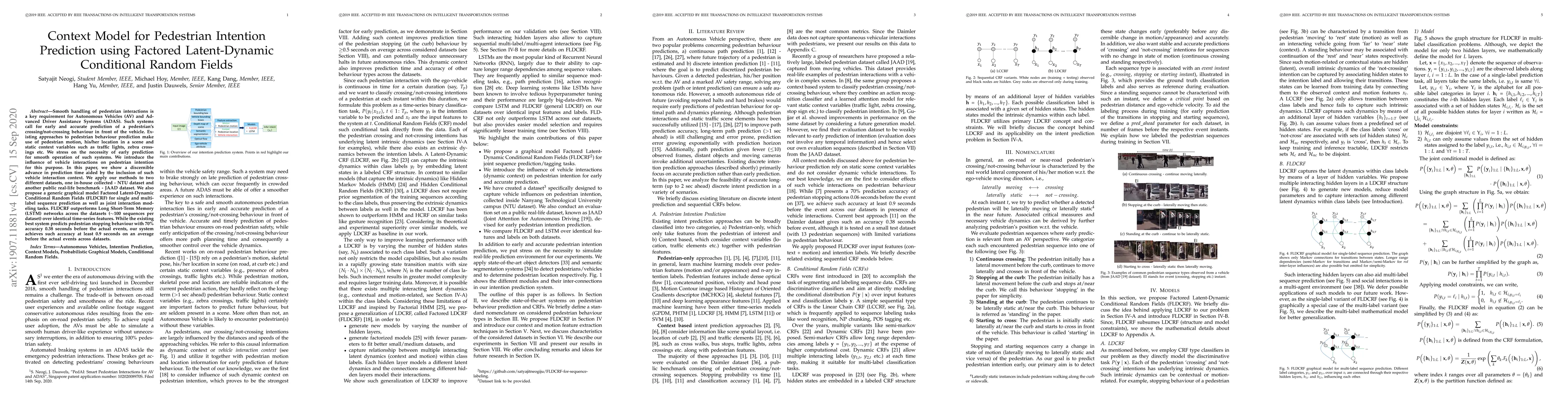 This paper introduces a Factored Latent-Dynamic Conditional Random Fields (FLDCRF) model for predicting pedestrian crossing intentions, emphasizing early prediction for autonomous vehicle systems. The proposed model outperforms LSTM networks, achieving higher accuracy and earlier prediction times by incorporating vehicle interaction context.