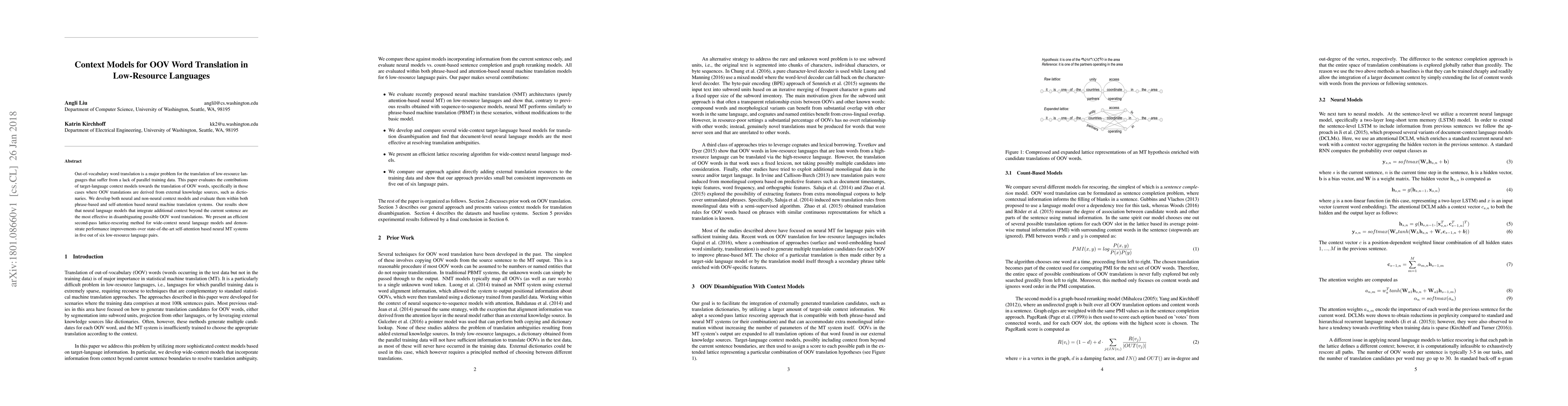 The research evaluates the effectiveness of target-language context models, both neural and non-neural, in disambiguating out-of-vocabulary (OOV) word translations in low-resource languages. It compares these models within phrase-based and self-attention-based neural machine translation systems, demonstrating performance improvements through a second-pass lattice-rescoring method for wide-context neural language models.