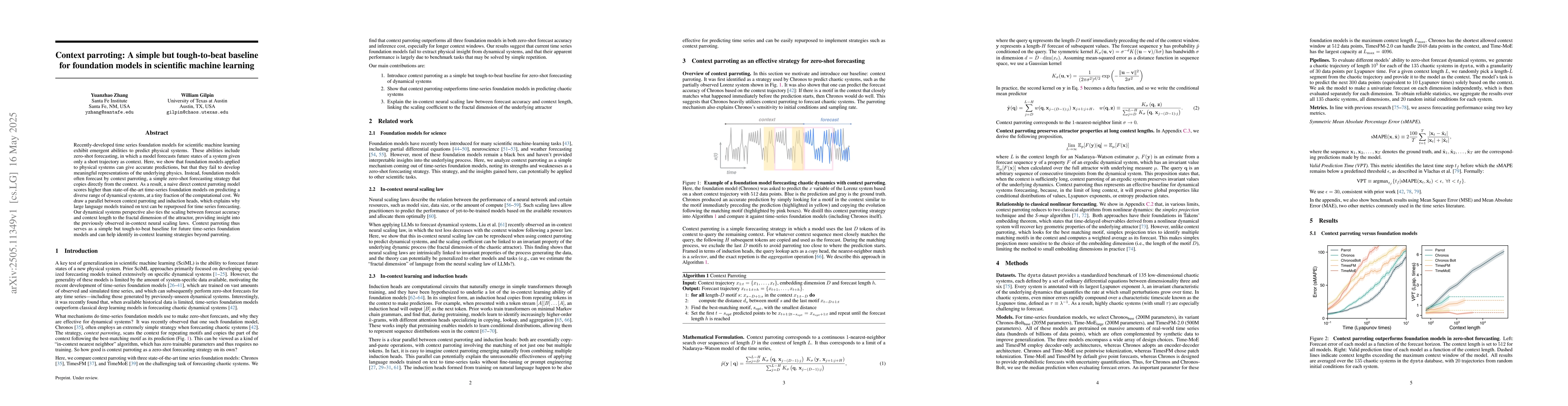 Recently-developed time series foundation models for scientific machine learning exhibit emergent abilities to predict physical systems. These abilities include zero-shot forecasting, in which a model forecasts future states of a system given only a short trajectory as context. Here, we show that foundation models applied to physical systems can give accurate predictions, but that they fail to develop meaningful representations of the underlying physics. Instead, foundation models often forecast by context parroting, a simple zero-shot forecasting strategy that copies directly from the context. As a result, a naive direct context parroting model scores higher than state-of-the-art time-series foundation models on predicting a diverse range of dynamical systems, at a tiny fraction of the computational cost. We draw a parallel between context parroting and induction heads, which explains why large language models trained on text can be repurposed for time series forecasting. Our dynamical systems perspective also ties the scaling between forecast accuracy and context length to the fractal dimension of the attractor, providing insight into the previously observed in-context neural scaling laws. Context parroting thus serves as a simple but tough-to-beat baseline for future time-series foundation models and can help identify in-context learning strategies beyond parroting.