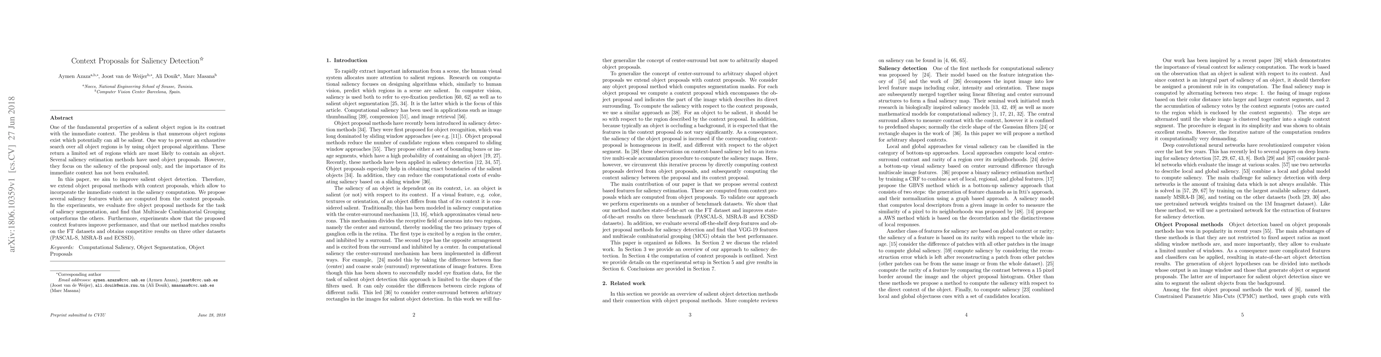 One of the fundamental properties of a salient object region is its contrast with the immediate context. The problem is that numerous object regions exist which potentially can all be salient. One way to prevent an exhaustive search over all object regions is by using object proposal algorithms. These return a limited set of regions which are most likely to contain an object. Several saliency estimation methods have used object proposals. However, they focus on the saliency of the proposal only, and the importance of its immediate context has not been evaluated. In this paper, we aim to improve salient object detection. Therefore, we extend object proposal methods with context proposals, which allow to incorporate the immediate context in the saliency computation. We propose several saliency features which are computed from the context proposals. In the experiments, we evaluate five object proposal methods for the task of saliency segmentation, and find that Multiscale Combinatorial Grouping outperforms the others. Furthermore, experiments show that the proposed context features improve performance, and that our method matches results on the FT datasets and obtains competitive results on three other datasets (PASCAL-S, MSRA-B and ECSSD).