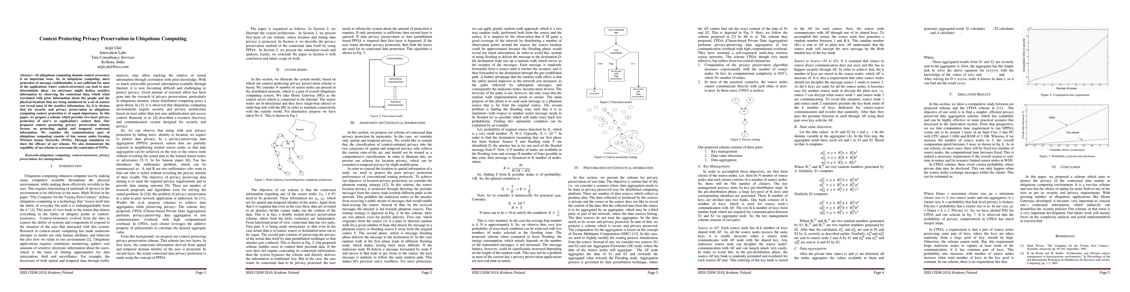 The paper presents a context protecting privacy preservation scheme that combines anonymity and data perturbation techniques for secure context data management in ubiquitous computing environments.
