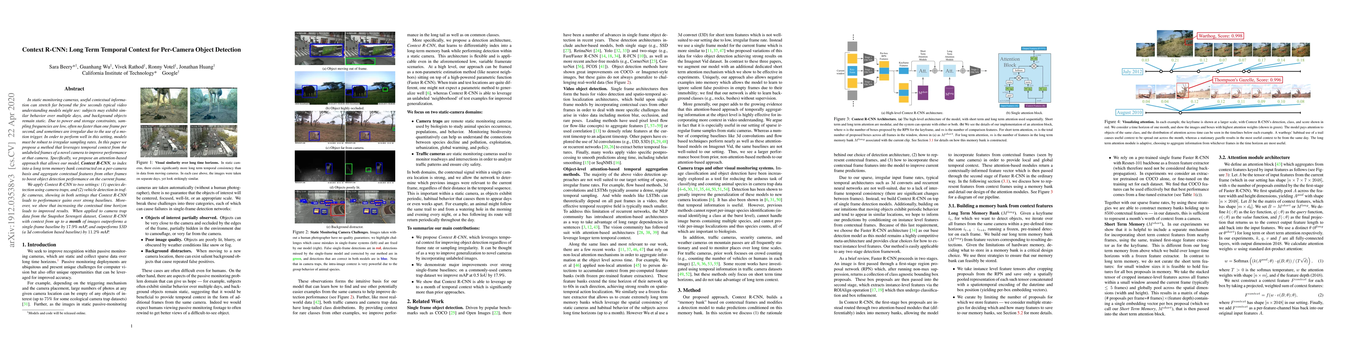 This research introduces Context R-CNN, a method that enhances object detection in static monitoring cameras by leveraging temporal context from unlabeled frames. The proposed attention-based model indexes into a long-term memory bank to aggregate contextual features, improving detection performance despite irregular sampling rates. The method demonstrates significant gains in species detection using camera traps and vehicle detection in traffic cameras, showing a notable improvement over baselines.