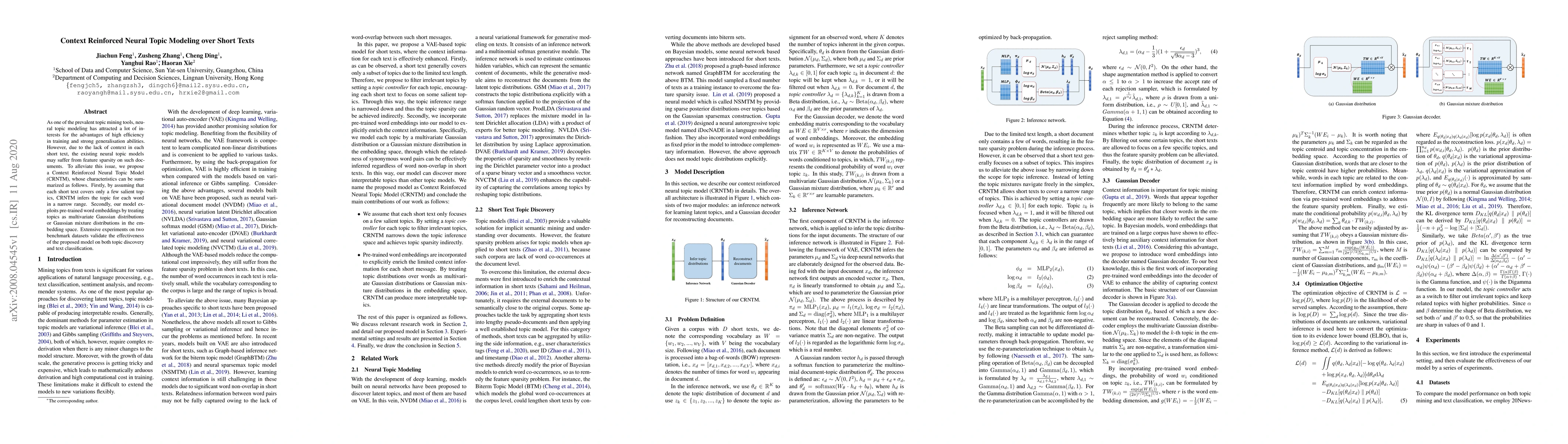 The paper proposes a Context Reinforced Neural Topic Model (CRNTM) to address feature sparsity in neural topic models applied to short texts. CRNTM infers topics within a limited range and uses pre-trained word embeddings, demonstrating improved performance in topic discovery and text classification on benchmark datasets.