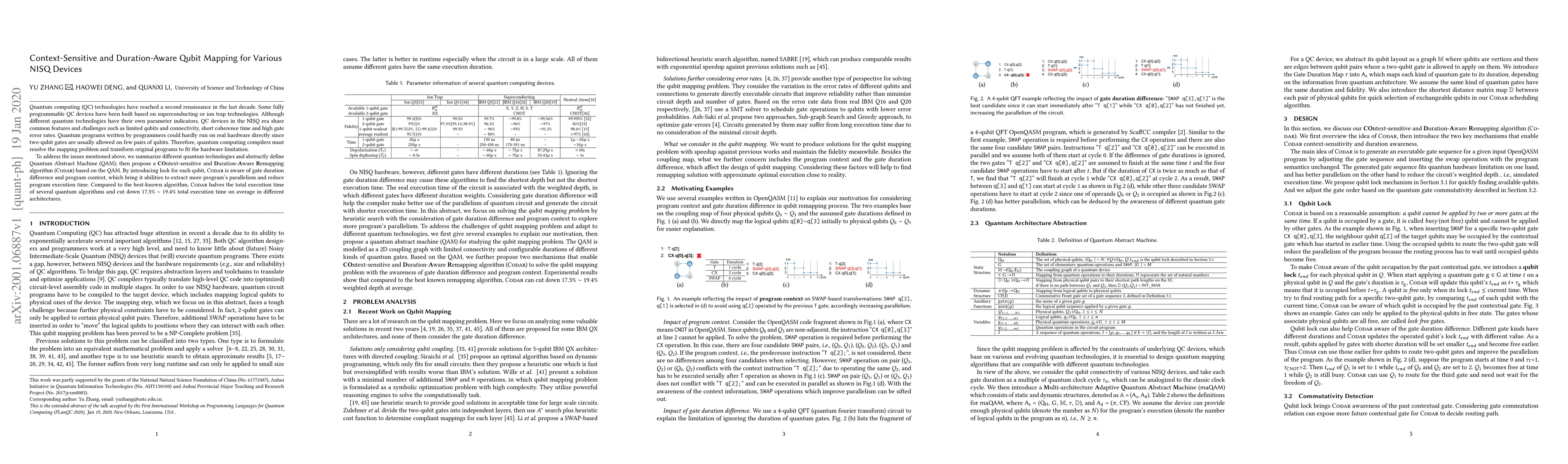 Quantum computing (QC) technologies have reached a second renaissance in the last decade. Some fully programmable QC devices have been built based on superconducting or ion trap technologies. Although different quantum technologies have their own parameter indicators, QC devices in the NISQ era share common features and challenges such as limited qubits and connectivity, short coherence time and high gate error rates. Quantum programs written by programmers could hardly run on real hardware directly since two-qubit gates are usually allowed on few pairs of qubits. Therefore, quantum computing compilers must resolve the mapping problem and transform original programs to fit the hardware limitation. To address the issues mentioned above, we summarize different quantum technologies and abstractly define Quantum Abstract Machine (QAM); then propose a COntext-sensitive and Duration-Aware Remapping algorithm (Codar) based on the QAM. By introducing lock for each qubit, Codar is aware of gate duration difference and program context, which bring it abilities to extract more program's parallelism and reduce program execution time. Compared to the best-known algorithm, Codar halves the total execution time of several quantum algorithms and cut down 17.5% - 19.4% total execution time on average in different architectures.