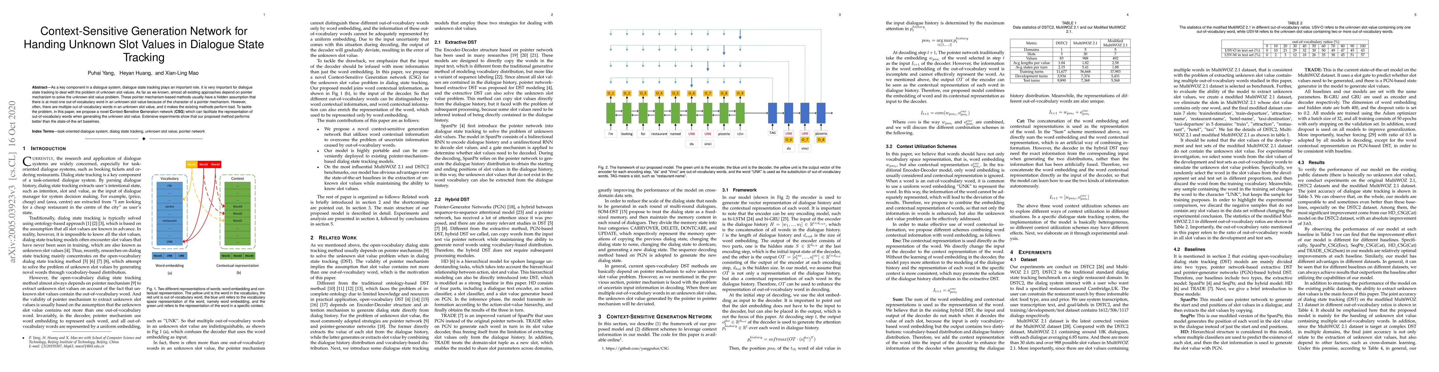 This paper proposes a novel Context-Sensitive Generation network (CSG) to handle unknown slot values in dialogue state tracking, addressing the limitation of pointer networks that assume at most one out-of-vocabulary word. The CSG network improves representation of multiple out-of-vocabulary words, outperforming existing methods in experiments.