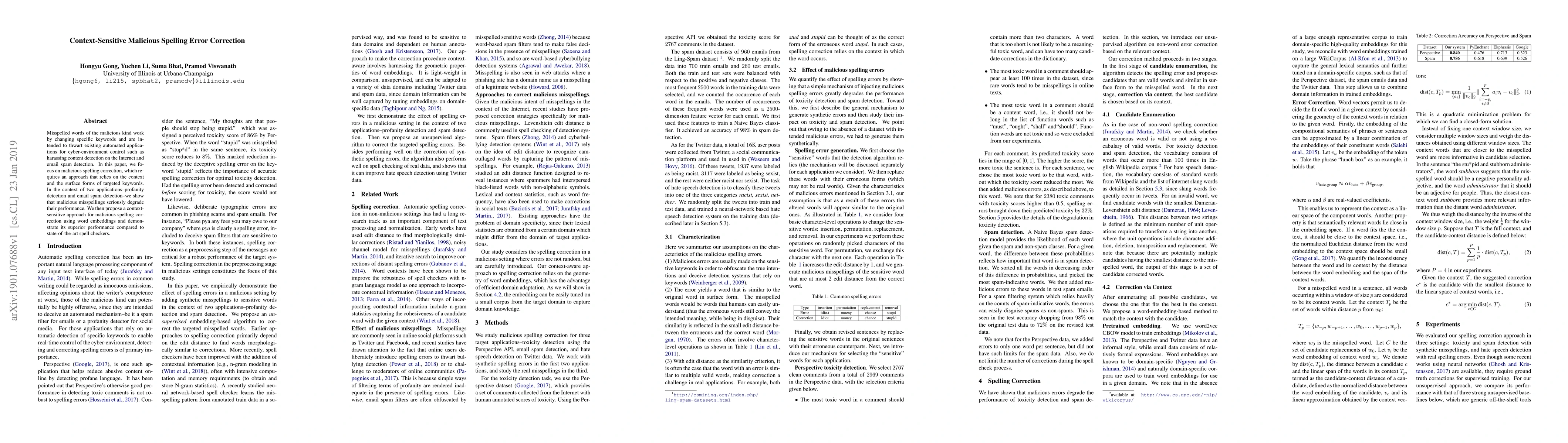 This paper addresses the issue of malicious misspellings that undermine automated systems like profanity and spam detection. It proposes a context-sensitive correction method using word embeddings, showing improved performance over existing spell checkers.