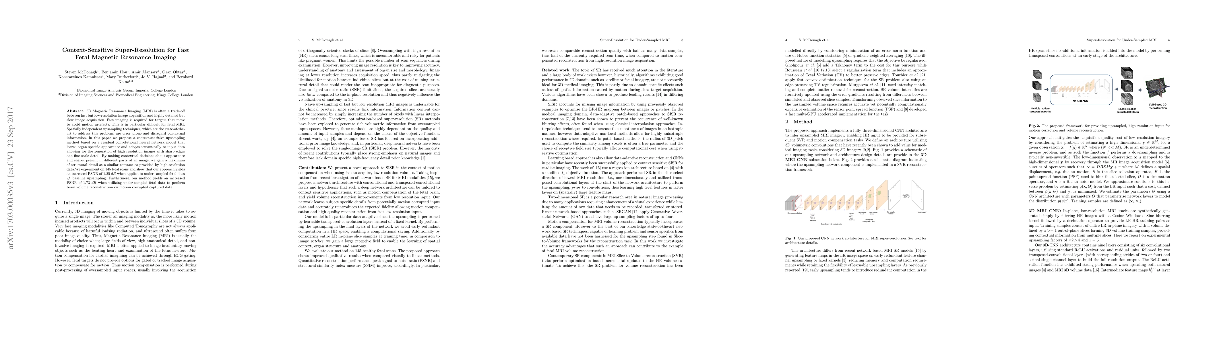 This paper proposes a context-sensitive super-resolution method using a residual convolutional neural network to enhance the resolution of fast fetal MRI scans. The method achieves higher PSNR values and better structural detail compared to baseline techniques, particularly in brain volume reconstruction from motion-corrupted data.