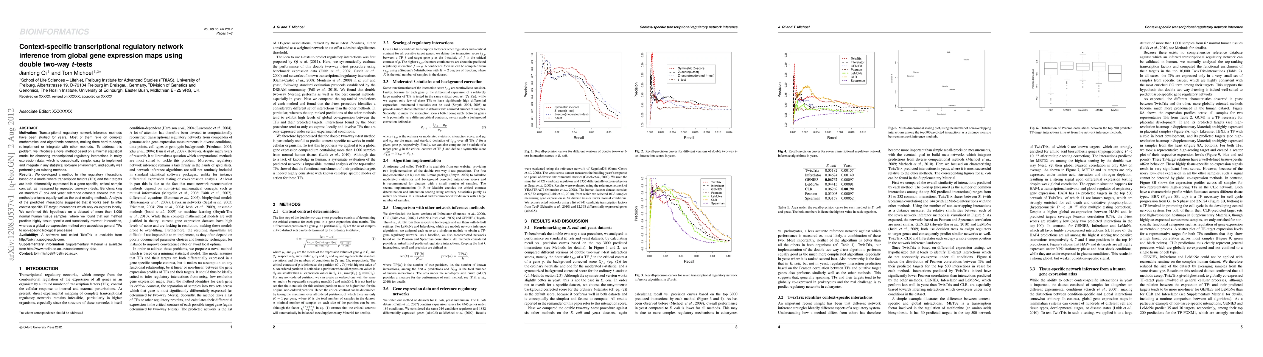 This paper introduces a novel, simple statistical method for inferring context-specific transcriptional regulatory networks using double two-way t-tests, which performs comparably to existing complex methods and is easy to implement and integrate. The method effectively predicts tissue-specific transcription factor-target interactions, as demonstrated by its application to human tissue datasets.