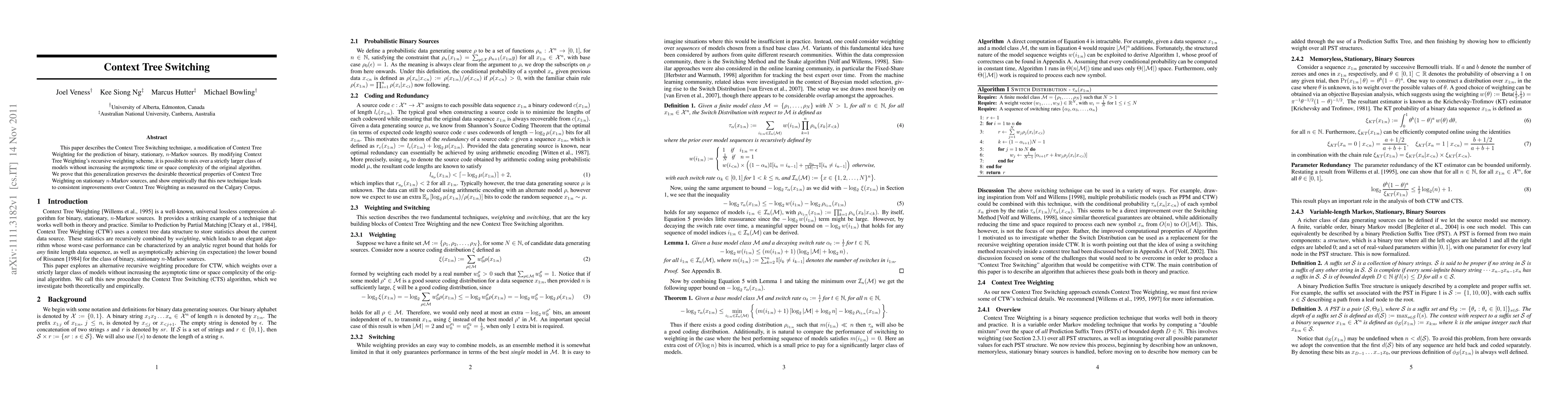 Context Tree Switching enhances Context Tree Weighting for predicting binary, n-Markov sources by expanding the mixable model class without extra computational costs. Empirically, it consistently outperforms Context Tree Weighting on the Calgary Corpus while maintaining theoretical properties.
