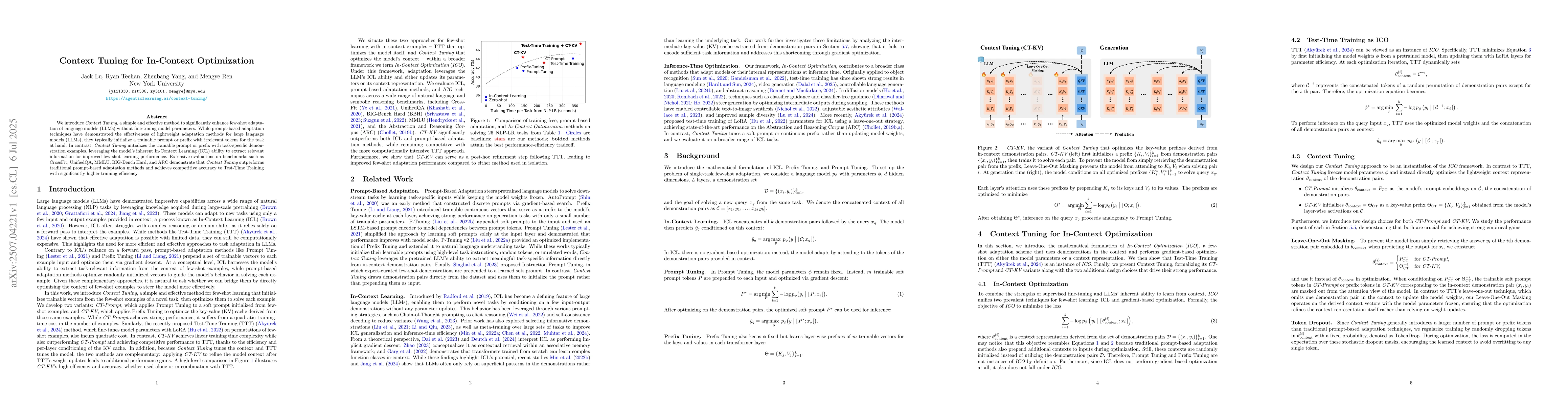 We introduce Context Tuning, a simple and effective method to significantly enhance few-shot adaptation of language models (LLMs) without fine-tuning model parameters. While prompt-based adaptation techniques have demonstrated the effectiveness of lightweight adaptation methods for large language models (LLMs), they typically initialize a trainable prompt or prefix with irrelevant tokens for the task at hand. In contrast, Context Tuning initializes the trainable prompt or prefix with task-specific demonstration examples, leveraging the model's inherent In-Context Learning (ICL) ability to extract relevant information for improved few-shot learning performance. Extensive evaluations on benchmarks such as CrossFit, UnifiedQA, MMLU, BIG-Bench Hard, and ARC demonstrate that Context Tuning outperforms traditional prompt-based adaptation methods and achieves competitive accuracy to Test-Time Training with significantly higher training efficiency.