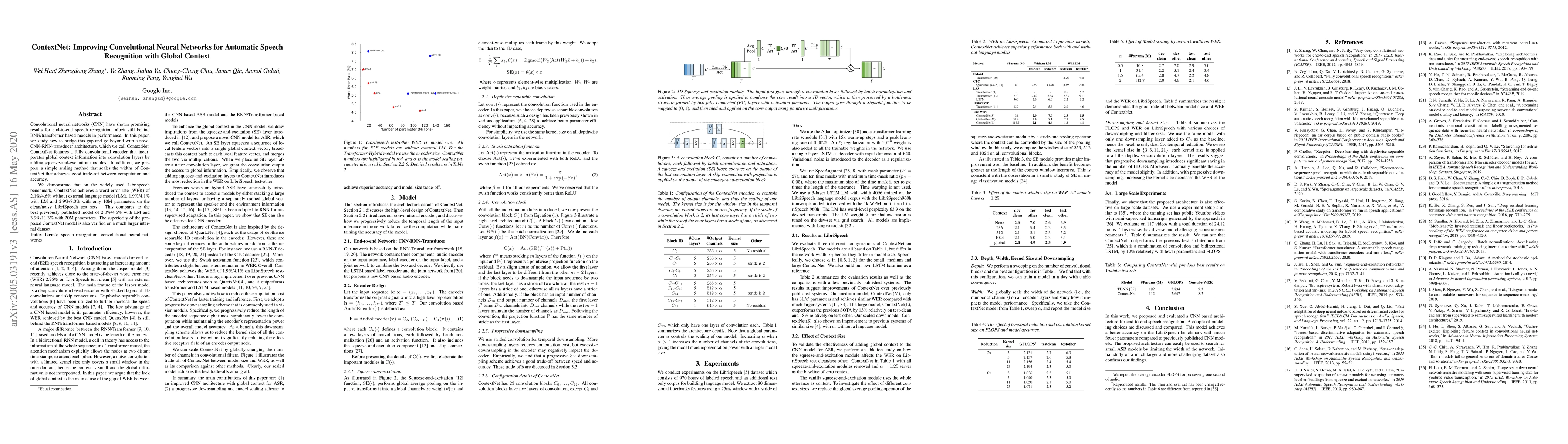 The research introduces ContextNet, a novel CNN-RNN-transducer architecture that enhances speech recognition performance. It incorporates global context via squeeze-and-excitation modules and a scaling method, achieving a word error rate of 2.1%/4.6% without LM, and 1.9%/4.1% with LM on the LibriSpeech benchmark, outperforming previous systems with fewer parameters.