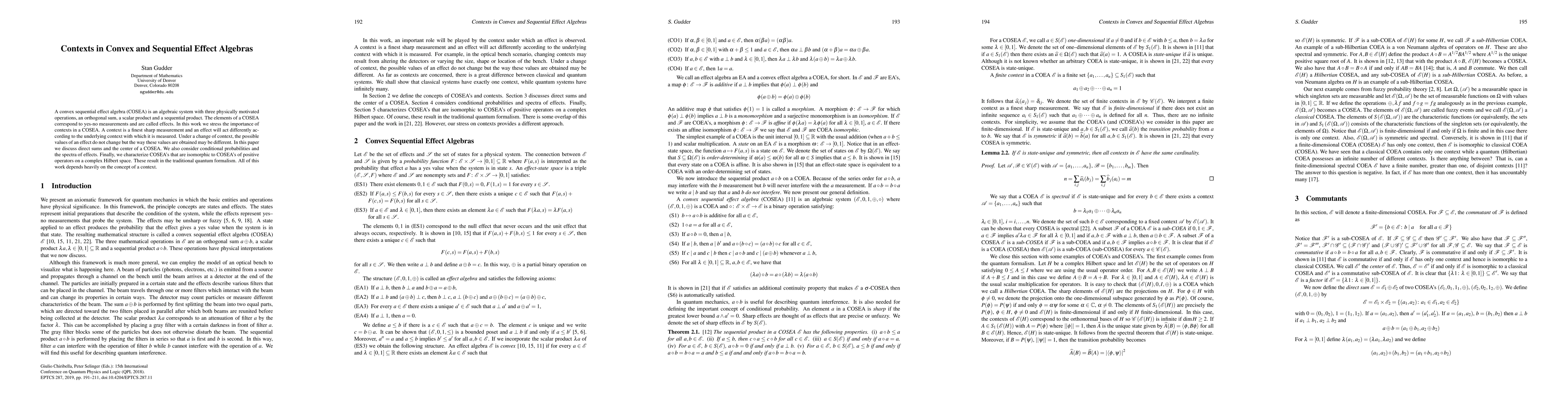 This paper explores convex sequential effect algebras (COSEAs), focusing on the role of contexts in determining how effects, corresponding to yes-no measurements, behave. It discusses direct sums, the center, conditional probabilities, and spectra of effects, and characterizes COSEAs isomorphic to those of positive operators on a complex Hilbert space, leading to traditional quantum formalism.