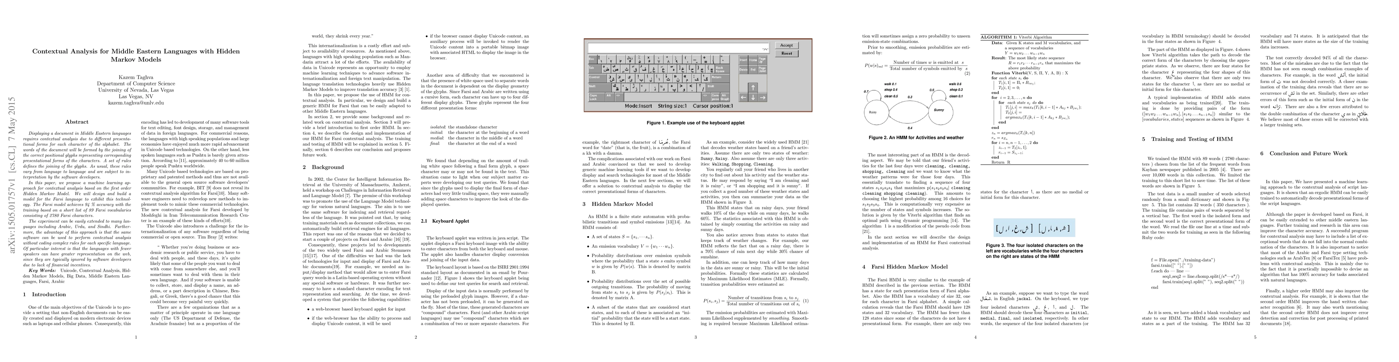 Displaying a document in Middle Eastern languages requires contextual analysis due to different presentational forms for each character of the alphabet. The words of the document will be formed by the joining of the correct positional glyphs representing corresponding presentational forms of the characters. A set of rules defines the joining of the glyphs. As usual, these rules vary from language to language and are subject to interpretation by the software developers. In this paper, we propose a machine learning approach for contextual analysis based on the first order Hidden Markov Model. We will design and build a model for the Farsi language to exhibit this technology. The Farsi model achieves 94 \% accuracy with the training based on a short list of 89 Farsi vocabularies consisting of 2780 Farsi characters. The experiment can be easily extended to many languages including Arabic, Urdu, and Sindhi. Furthermore, the advantage of this approach is that the same software can be used to perform contextual analysis without coding complex rules for each specific language. Of particular interest is that the languages with fewer speakers can have greater representation on the web, since they are typically ignored by software developers due to lack of financial incentives.